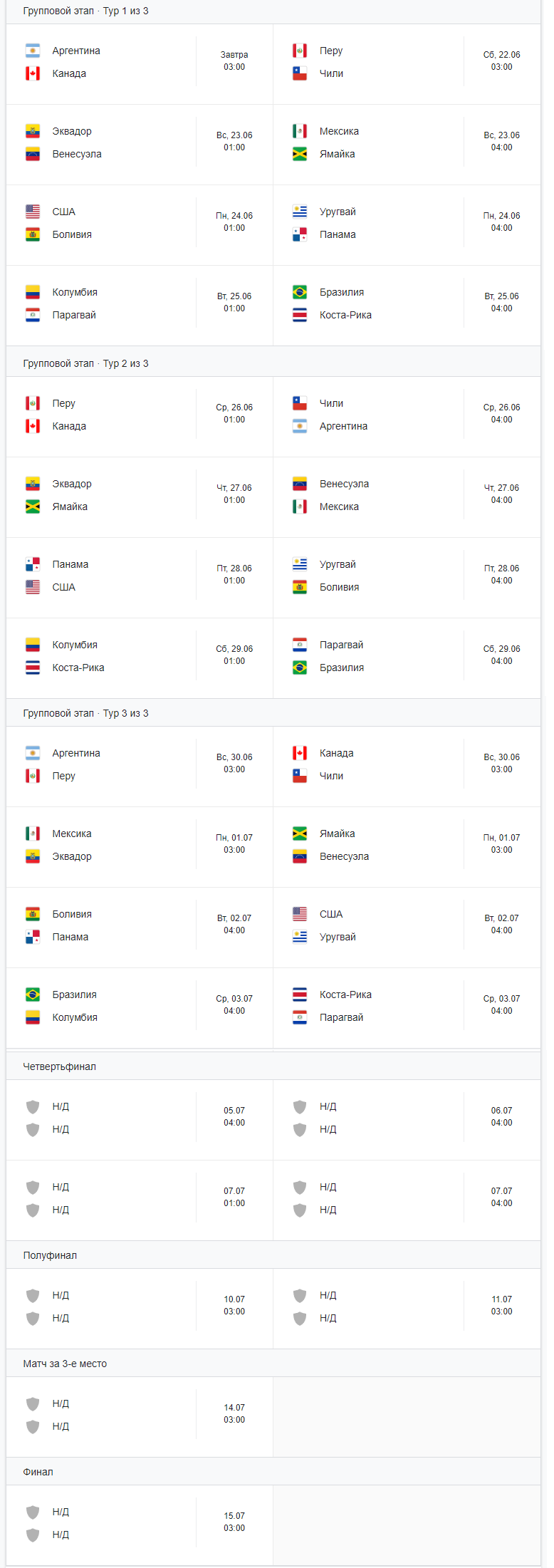 В чемпионате участвуют 16 национальных команд. 10 из южной Америки и 6 из северной (пик 2). Чемпионат проходит в США, поэтому по Москве все матчи будут проходить ночью. Самые ранние в 1 час ночи. Расписание по Москве пик 3. Права на российскую трансляцию у ОККО.