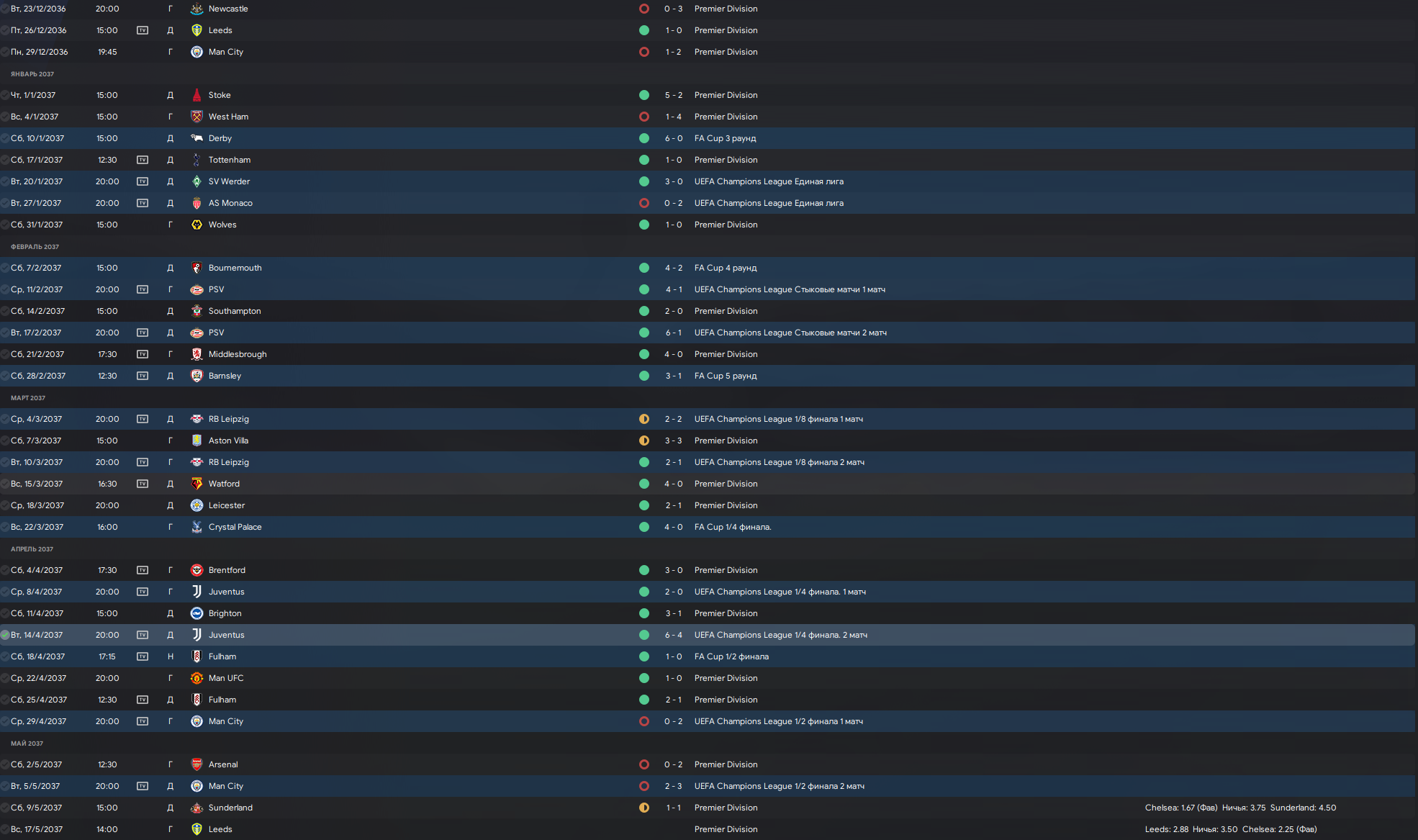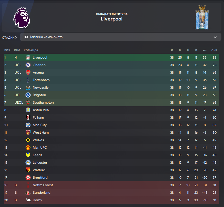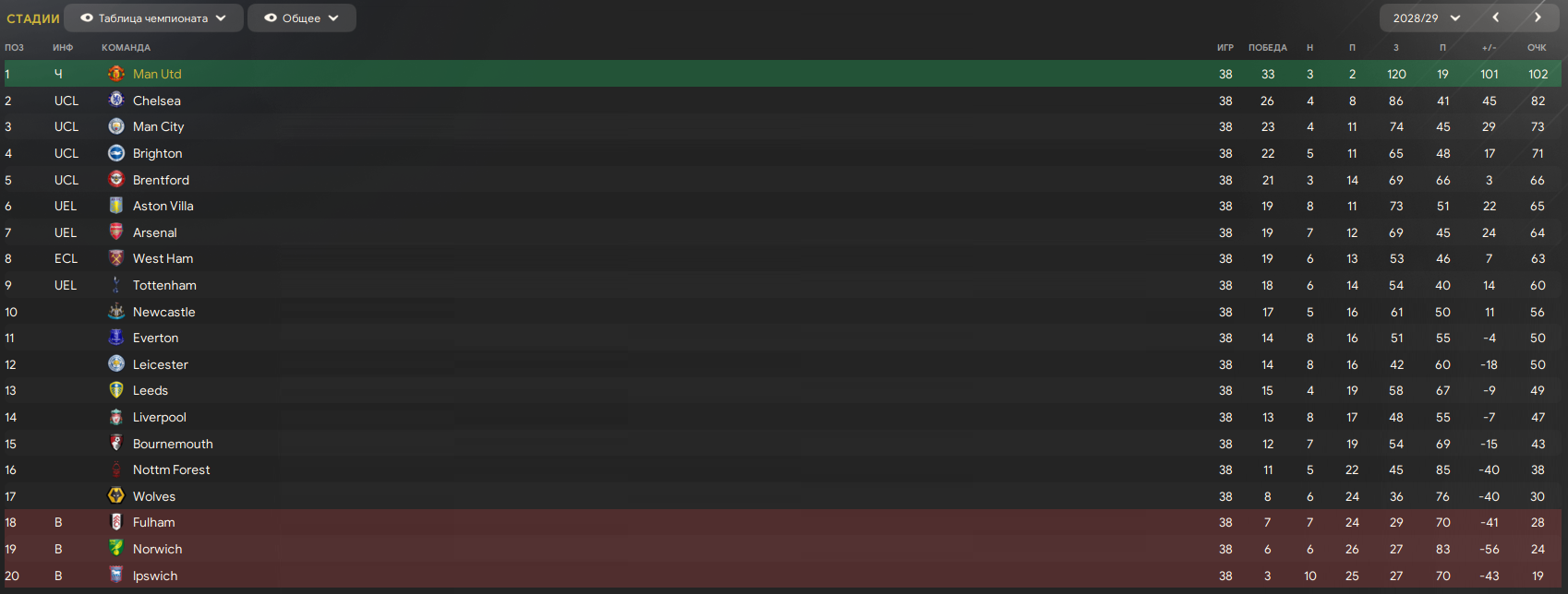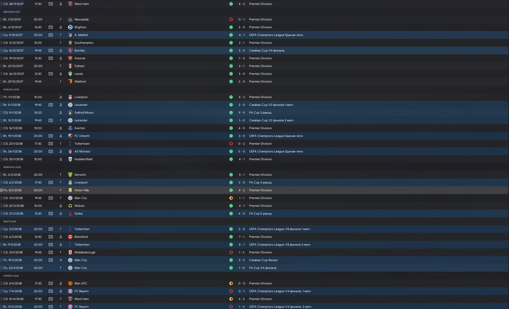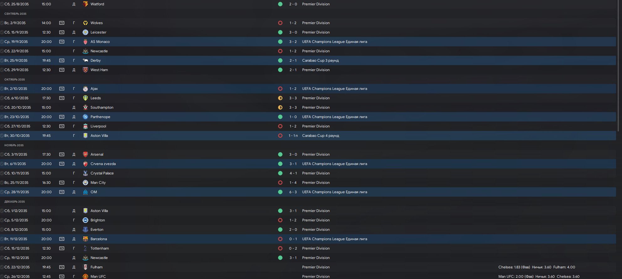 откатал 13-ый по счету сезон. итоговая таблица АПЕЛЕ, результаты матчей. из позитивного: каким-то хуем зацепились за ЛЧ в финале обыграв ПСЖ. по ходу сезона мне уже дважды приходилось играть против них и особых проблем мы тогда не испытали. на финал выходил со стойким ощущением неизбежной победы. сколько таких ощущений по ходу сезона ФМ заставил меня проглотить и умыться. я уж было подумал что скрипт выводит меня на финал против Лацио, т.к. в 1/2 ПСЖ достались именно римляне. вообще путь до финала это сплошной валидол. сначала 1/8 с Бенфикой, где в первом матче к 70-ой минуте мы вели 0-3 в гостях, а к 90-ой счет был уже 4-3 и только гол на 90+3 позволил увезти из Лиссабона хотя бы ничью. на третий день после шоковой терапии в Лиссабоне, моей нервной системе было суждено пережить еще один триллер в финале кубка Carabao против МЮ. 2-2 в основное, на 92-ой МЮ выходит вперед едва успели начаться овертаймы. спустя 2 минуты счет сравнивает герой этого матча Greg Hilson, который до конца второго овертайма отгружает еще двушку и в конечном итоге записывает на свой счет покер. после этого начался валидольный отрезок матчей "на тоненького" где победы с разницей в один мяч выгрызались зубами. снова Атлетико, снова Реал. в той же последовательности что и в прошлом году. кое-как со скрипом сдюжили и оказались в финале. в самой АПЛ как уже и говорил ранее плотность просто ебейшая. за 4 тура до конца святые шли на 2 месте в итоге оказавшись 7-ми))))) на вторую/третью строчки претендуют сразу 9 команд. надеюсь победа в ЛЧ даст мне иммунитет к увольнению при хуёвых результатах, потому что в планах продолжать ломать и строить сызнова, что непременно скажется на результатах.