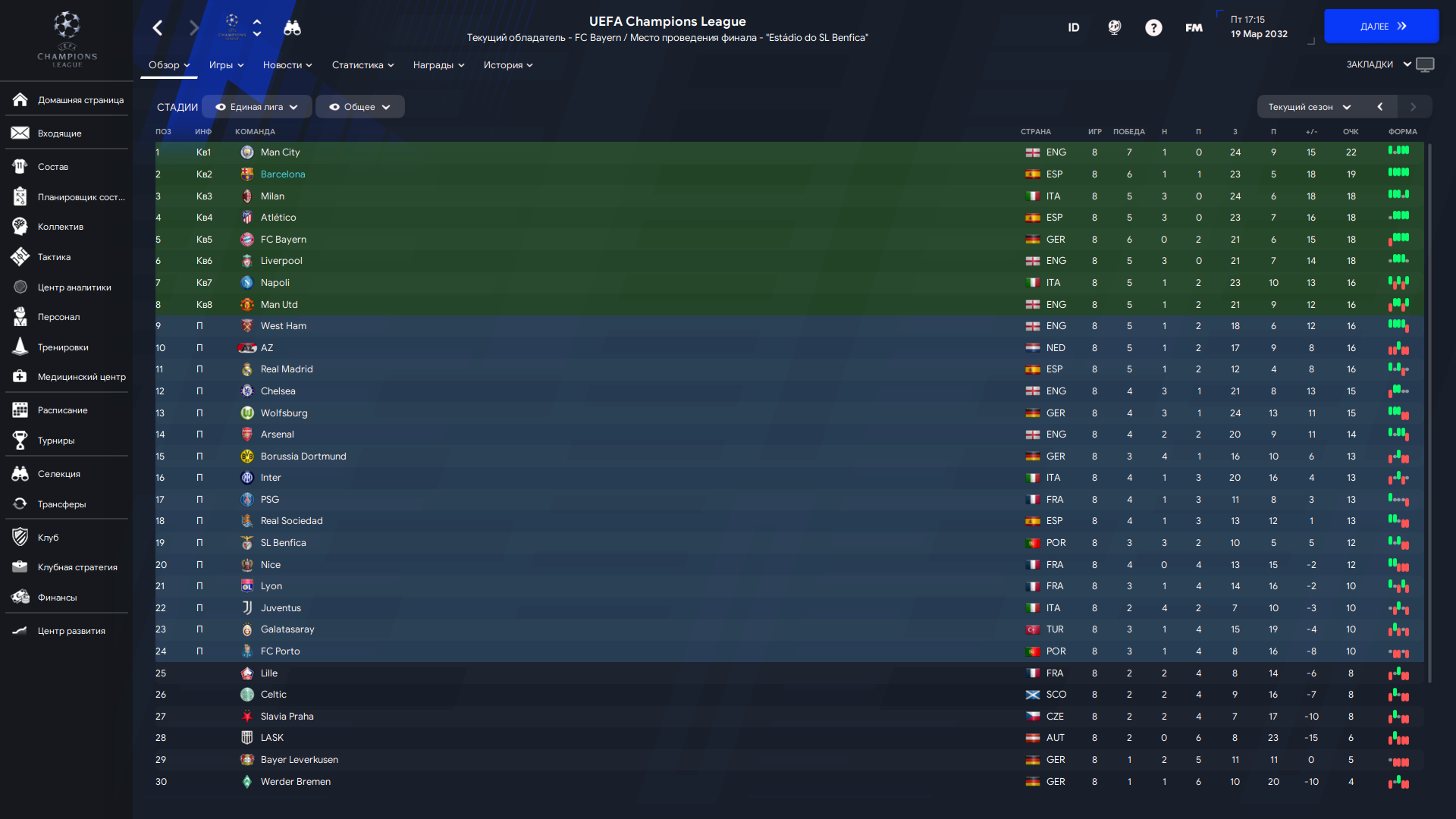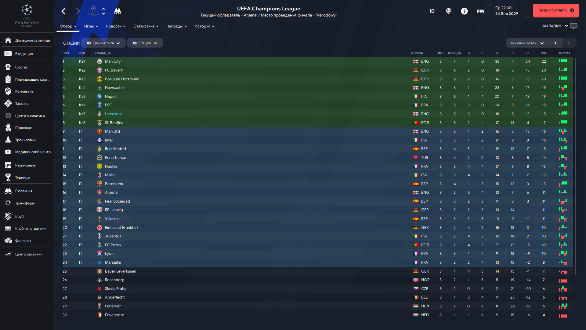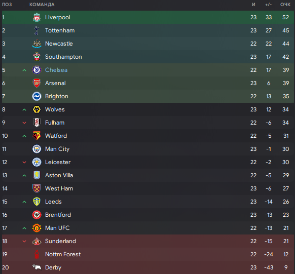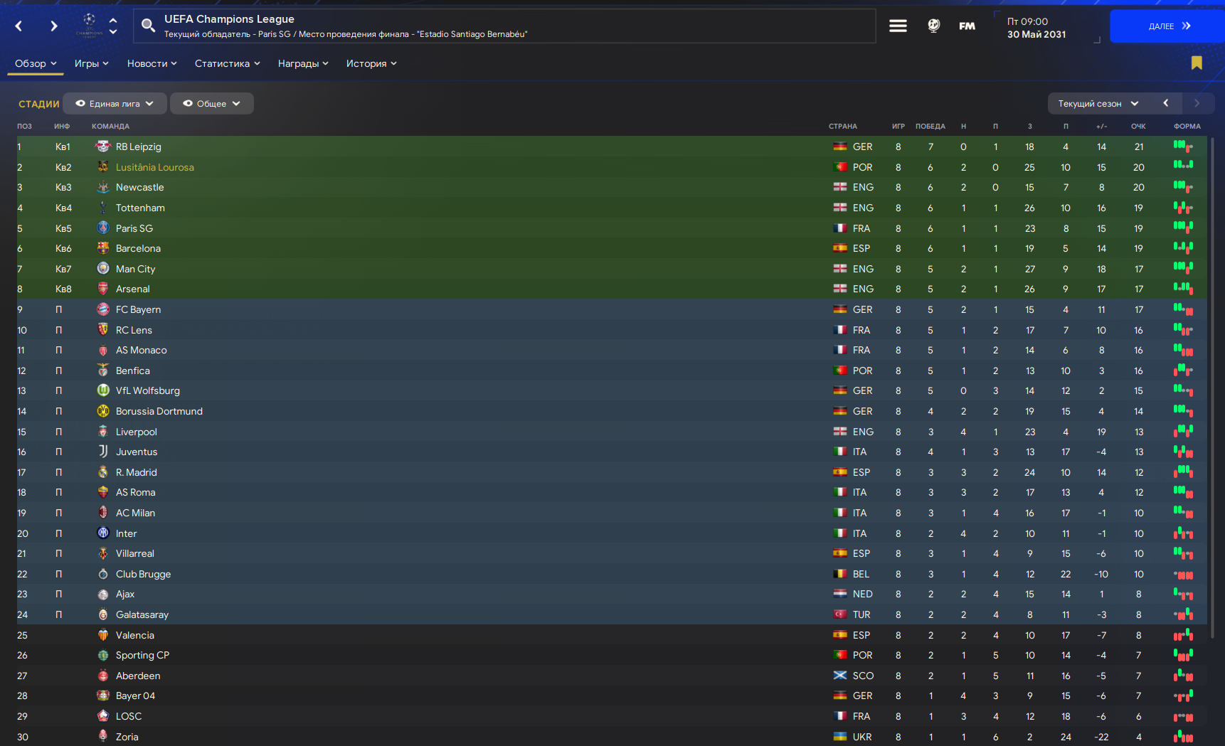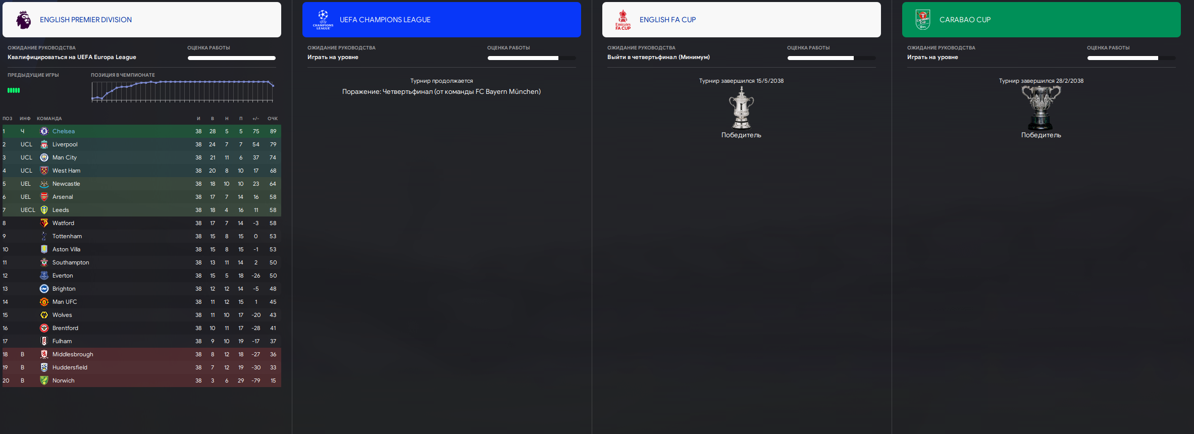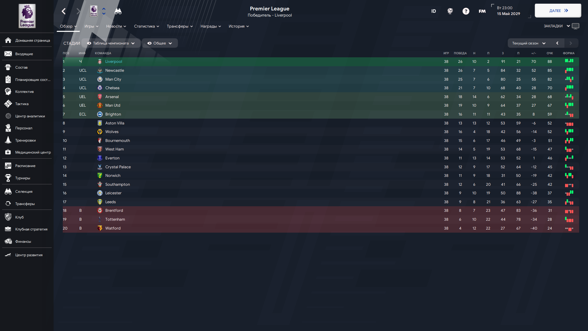 откатал 13-ый по счету сезон. итоговая таблица АПЕЛЕ, результаты матчей. из позитивного: каким-то хуем зацепились за ЛЧ в финале обыграв ПСЖ. по ходу сезона мне уже дважды приходилось играть против них и особых проблем мы тогда не испытали. на финал выходил со стойким ощущением неизбежной победы. сколько таких ощущений по ходу сезона ФМ заставил меня проглотить и умыться. я уж было подумал что скрипт выводит меня на финал против Лацио, т.к. в 1/2 ПСЖ достались именно римляне. вообще путь до финала это сплошной валидол. сначала 1/8 с Бенфикой, где в первом матче к 70-ой минуте мы вели 0-3 в гостях, а к 90-ой счет был уже 4-3 и только гол на 90+3 позволил увезти из Лиссабона хотя бы ничью. на третий день после шоковой терапии в Лиссабоне, моей нервной системе было суждено пережить еще один триллер в финале кубка Carabao против МЮ. 2-2 в основное, на 92-ой МЮ выходит вперед едва успели начаться овертаймы. спустя 2 минуты счет сравнивает герой этого матча Greg Hilson, который до конца второго овертайма отгружает еще двушку и в конечном итоге записывает на свой счет покер. после этого начался валидольный отрезок матчей "на тоненького" где победы с разницей в один мяч выгрызались зубами. снова Атлетико, снова Реал. в той же последовательности что и в прошлом году. кое-как со скрипом сдюжили и оказались в финале. в самой АПЛ как уже и говорил ранее плотность просто ебейшая. за 4 тура до конца святые шли на 2 месте в итоге оказавшись 7-ми))))) на вторую/третью строчки претендуют сразу 9 команд. надеюсь победа в ЛЧ даст мне иммунитет к увольнению при хуёвых результатах, потому что в планах продолжать ломать и строить сызнова, что непременно скажется на результатах.