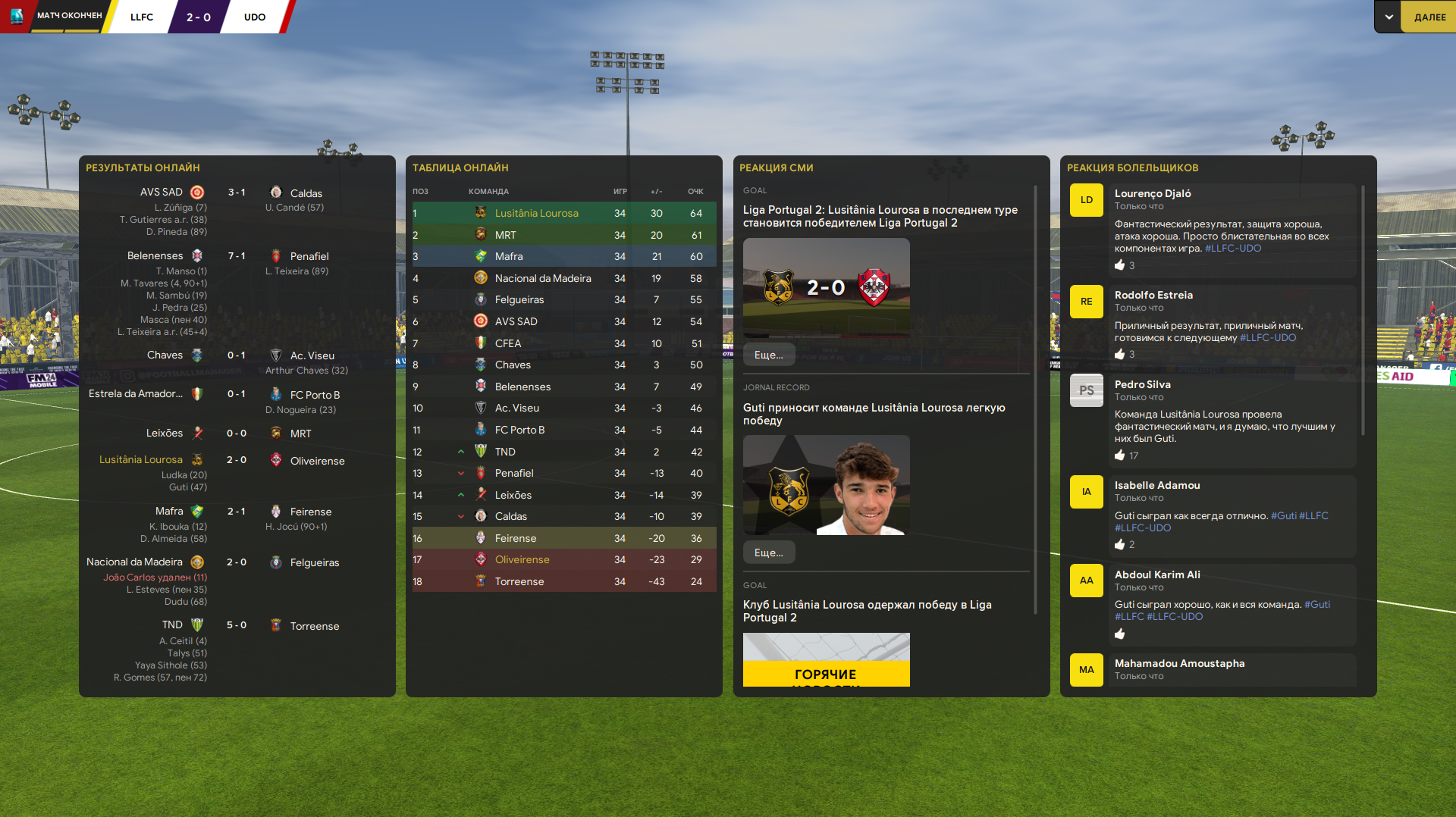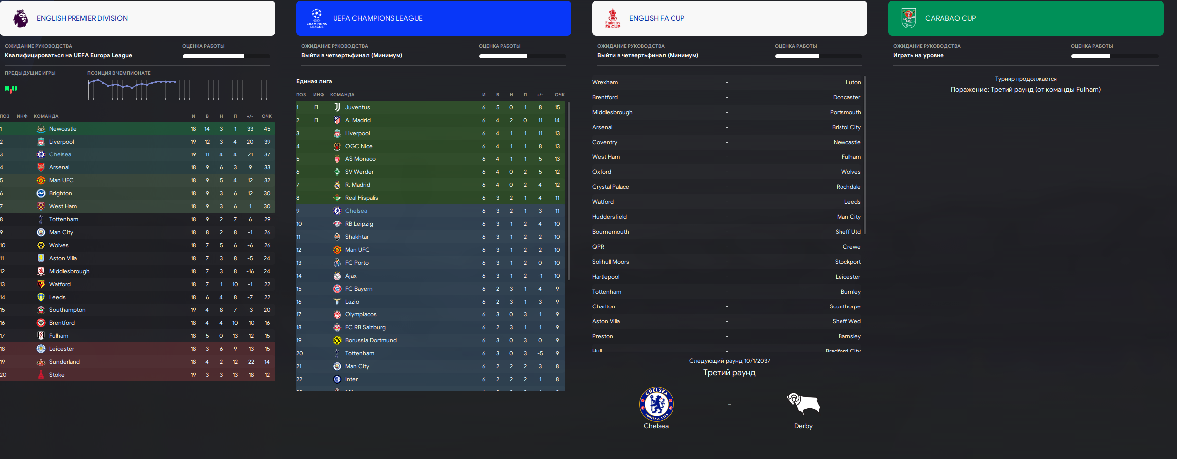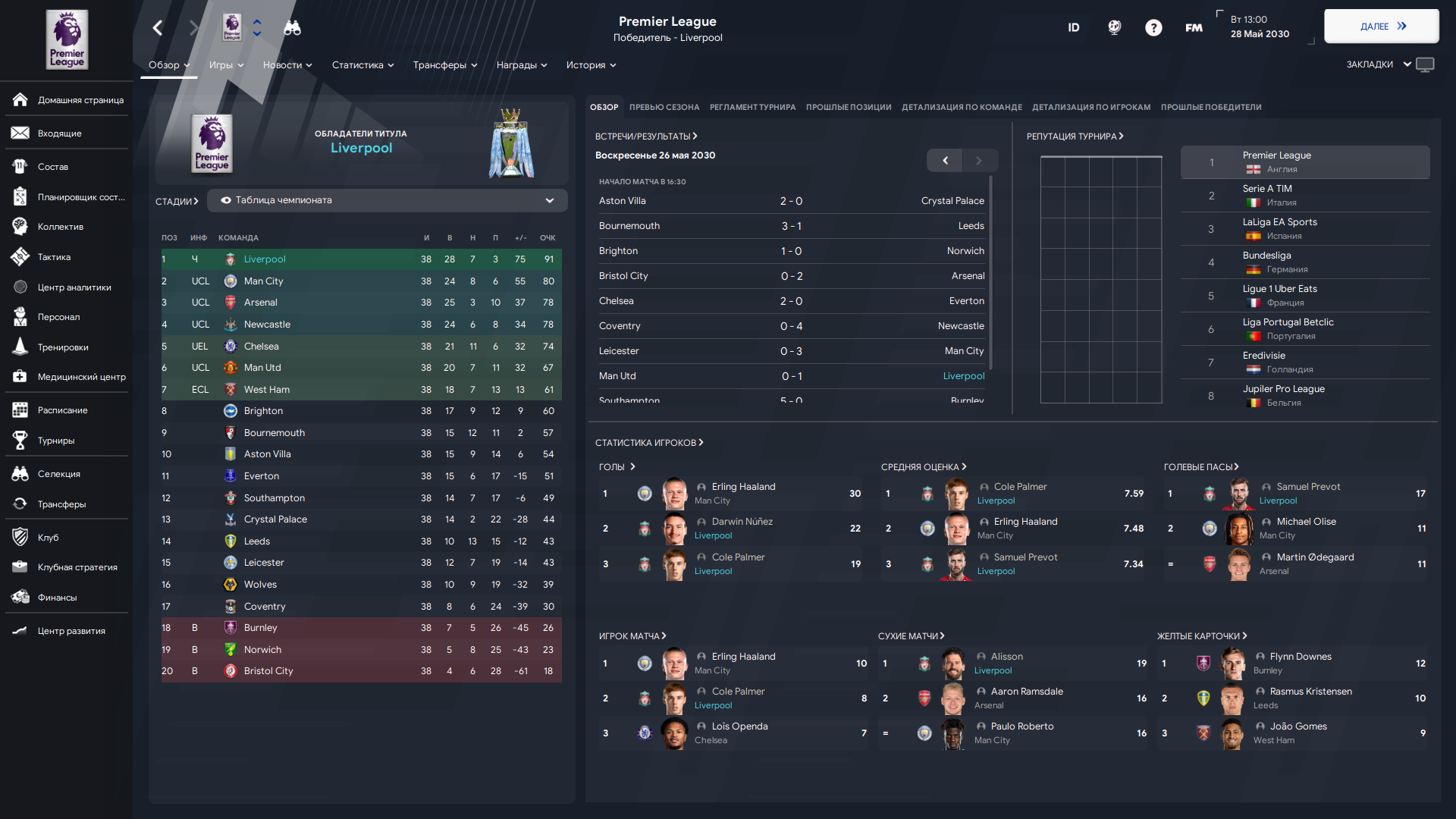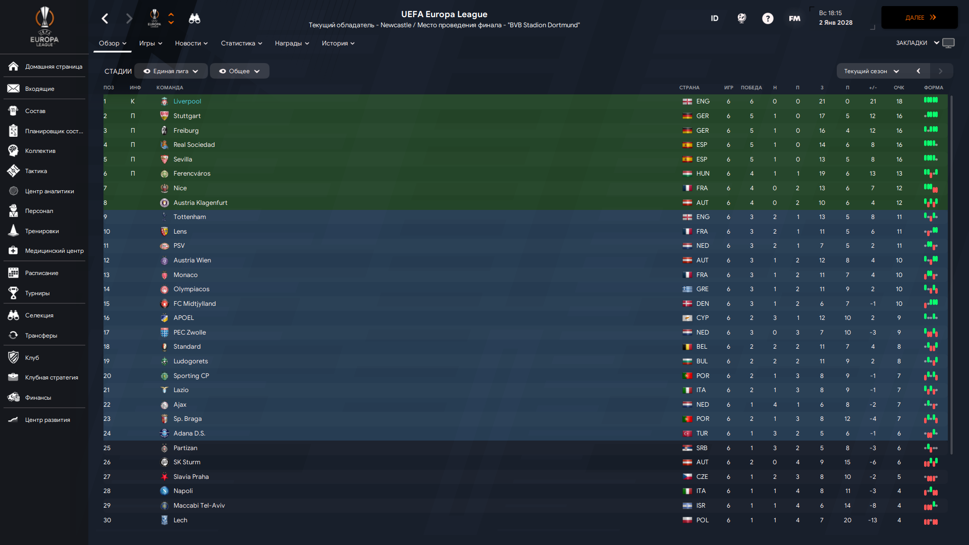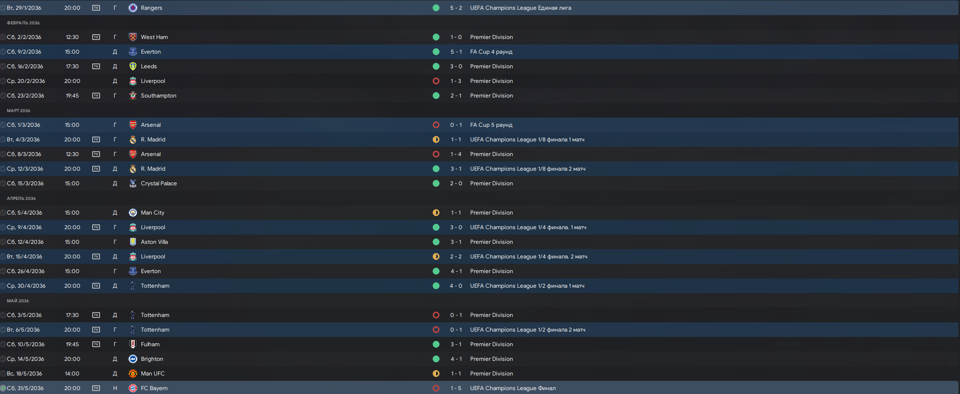 откатал 13-ый по счету сезон. итоговая таблица АПЕЛЕ, результаты матчей. из позитивного: каким-то хуем зацепились за ЛЧ в финале обыграв ПСЖ. по ходу сезона мне уже дважды приходилось играть против них и особых проблем мы тогда не испытали. на финал выходил со стойким ощущением неизбежной победы. сколько таких ощущений по ходу сезона ФМ заставил меня проглотить и умыться. я уж было подумал что скрипт выводит меня на финал против Лацио, т.к. в 1/2 ПСЖ достались именно римляне. вообще путь до финала это сплошной валидол. сначала 1/8 с Бенфикой, где в первом матче к 70-ой минуте мы вели 0-3 в гостях, а к 90-ой счет был уже 4-3 и только гол на 90+3 позволил увезти из Лиссабона хотя бы ничью. на третий день после шоковой терапии в Лиссабоне, моей нервной системе было суждено пережить еще один триллер в финале кубка Carabao против МЮ. 2-2 в основное, на 92-ой МЮ выходит вперед едва успели начаться овертаймы. спустя 2 минуты счет сравнивает герой этого матча Greg Hilson, который до конца второго овертайма отгружает еще двушку и в конечном итоге записывает на свой счет покер. после этого начался валидольный отрезок матчей "на тоненького" где победы с разницей в один мяч выгрызались зубами. снова Атлетико, снова Реал. в той же последовательности что и в прошлом году. кое-как со скрипом сдюжили и оказались в финале. в самой АПЛ как уже и говорил ранее плотность просто ебейшая. за 4 тура до конца святые шли на 2 месте в итоге оказавшись 7-ми))))) на вторую/третью строчки претендуют сразу 9 команд. надеюсь победа в ЛЧ даст мне иммунитет к увольнению при хуёвых результатах, потому что в планах продолжать ломать и строить сызнова, что непременно скажется на результатах.