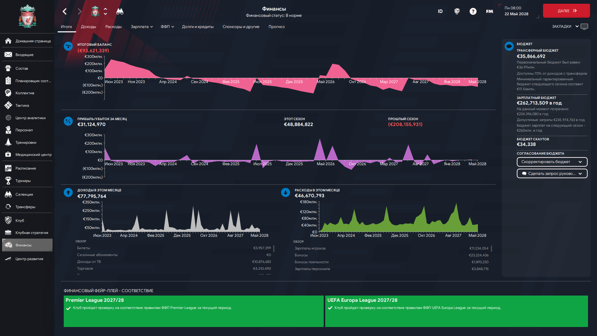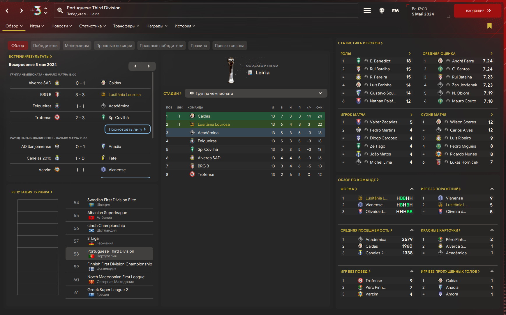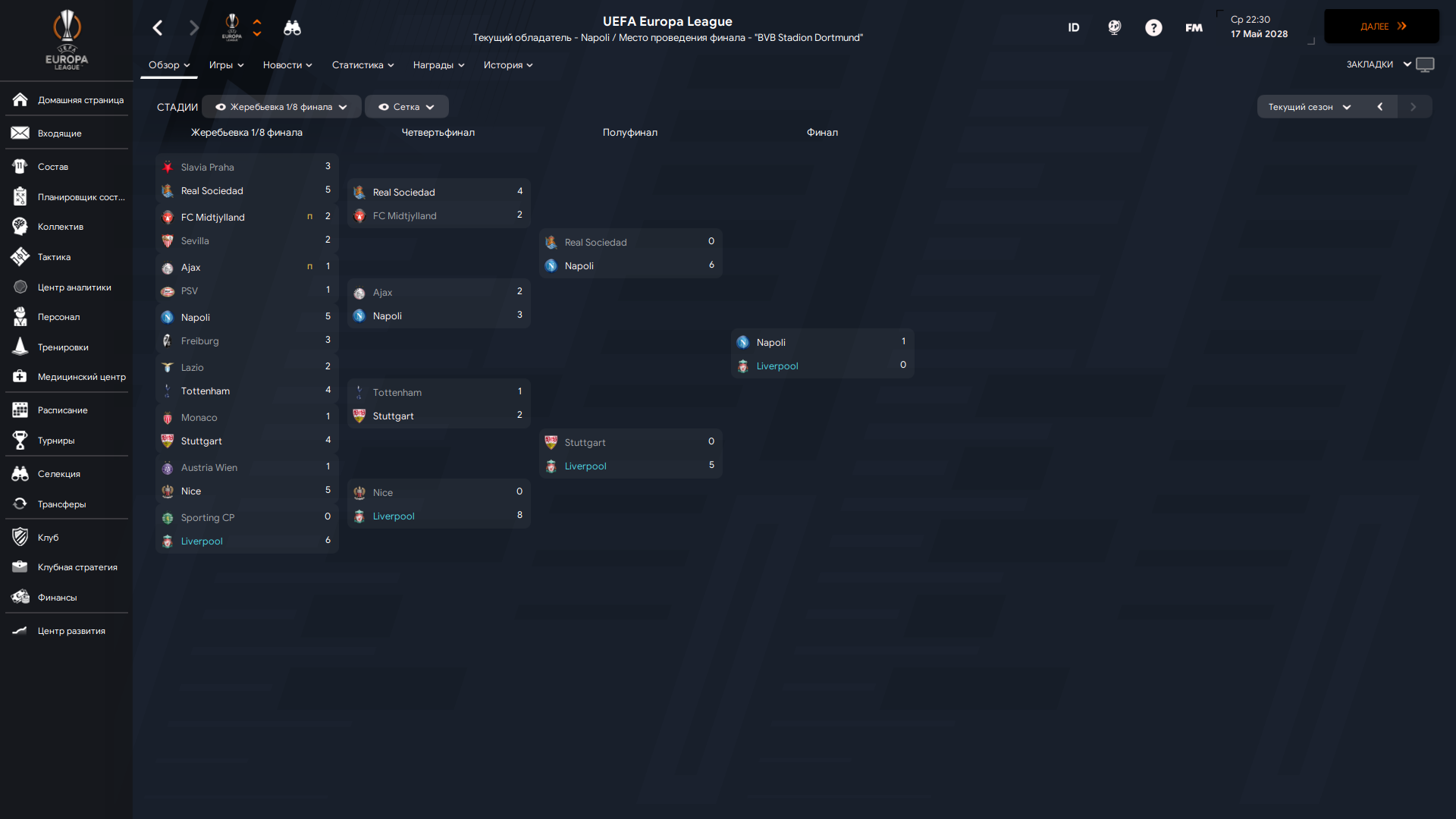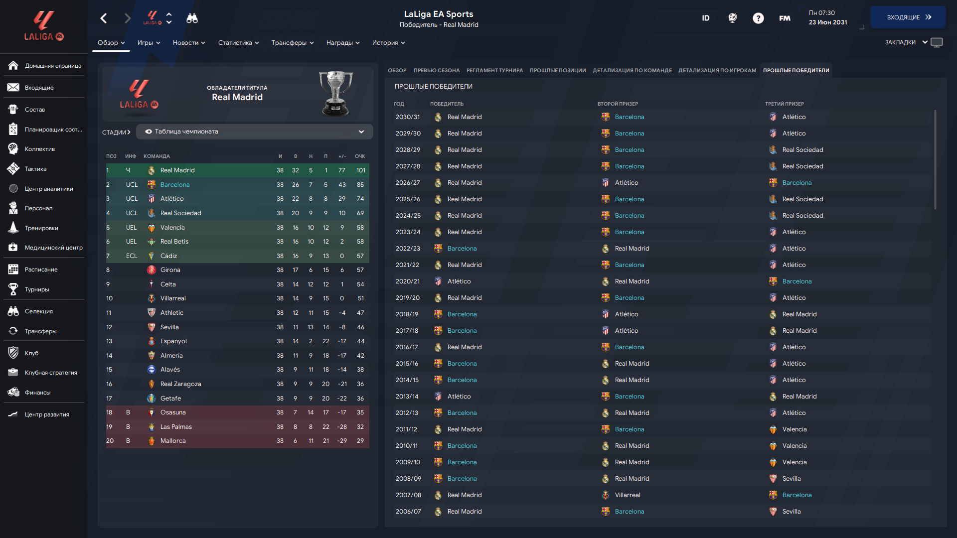 откатал 13-ый по счету сезон. итоговая таблица АПЕЛЕ, результаты матчей. из позитивного: каким-то хуем зацепились за ЛЧ в финале обыграв ПСЖ. по ходу сезона мне уже дважды приходилось играть против них и особых проблем мы тогда не испытали. на финал выходил со стойким ощущением неизбежной победы. сколько таких ощущений по ходу сезона ФМ заставил меня проглотить и умыться. я уж было подумал что скрипт выводит меня на финал против Лацио, т.к. в 1/2 ПСЖ достались именно римляне. вообще путь до финала это сплошной валидол. сначала 1/8 с Бенфикой, где в первом матче к 70-ой минуте мы вели 0-3 в гостях, а к 90-ой счет был уже 4-3 и только гол на 90+3 позволил увезти из Лиссабона хотя бы ничью. на третий день после шоковой терапии в Лиссабоне, моей нервной системе было суждено пережить еще один триллер в финале кубка Carabao против МЮ. 2-2 в основное, на 92-ой МЮ выходит вперед едва успели начаться овертаймы. спустя 2 минуты счет сравнивает герой этого матча Greg Hilson, который до конца второго овертайма отгружает еще двушку и в конечном итоге записывает на свой счет покер. после этого начался валидольный отрезок матчей "на тоненького" где победы с разницей в один мяч выгрызались зубами. снова Атлетико, снова Реал. в той же последовательности что и в прошлом году. кое-как со скрипом сдюжили и оказались в финале. в самой АПЛ как уже и говорил ранее плотность просто ебейшая. за 4 тура до конца святые шли на 2 месте в итоге оказавшись 7-ми))))) на вторую/третью строчки претендуют сразу 9 команд. надеюсь победа в ЛЧ даст мне иммунитет к увольнению при хуёвых результатах, потому что в планах продолжать ломать и строить сызнова, что непременно скажется на результатах.