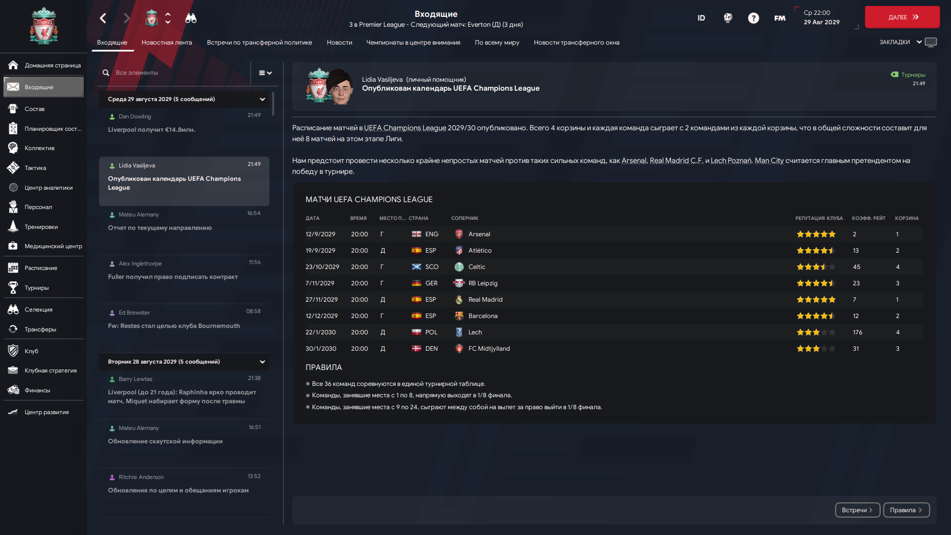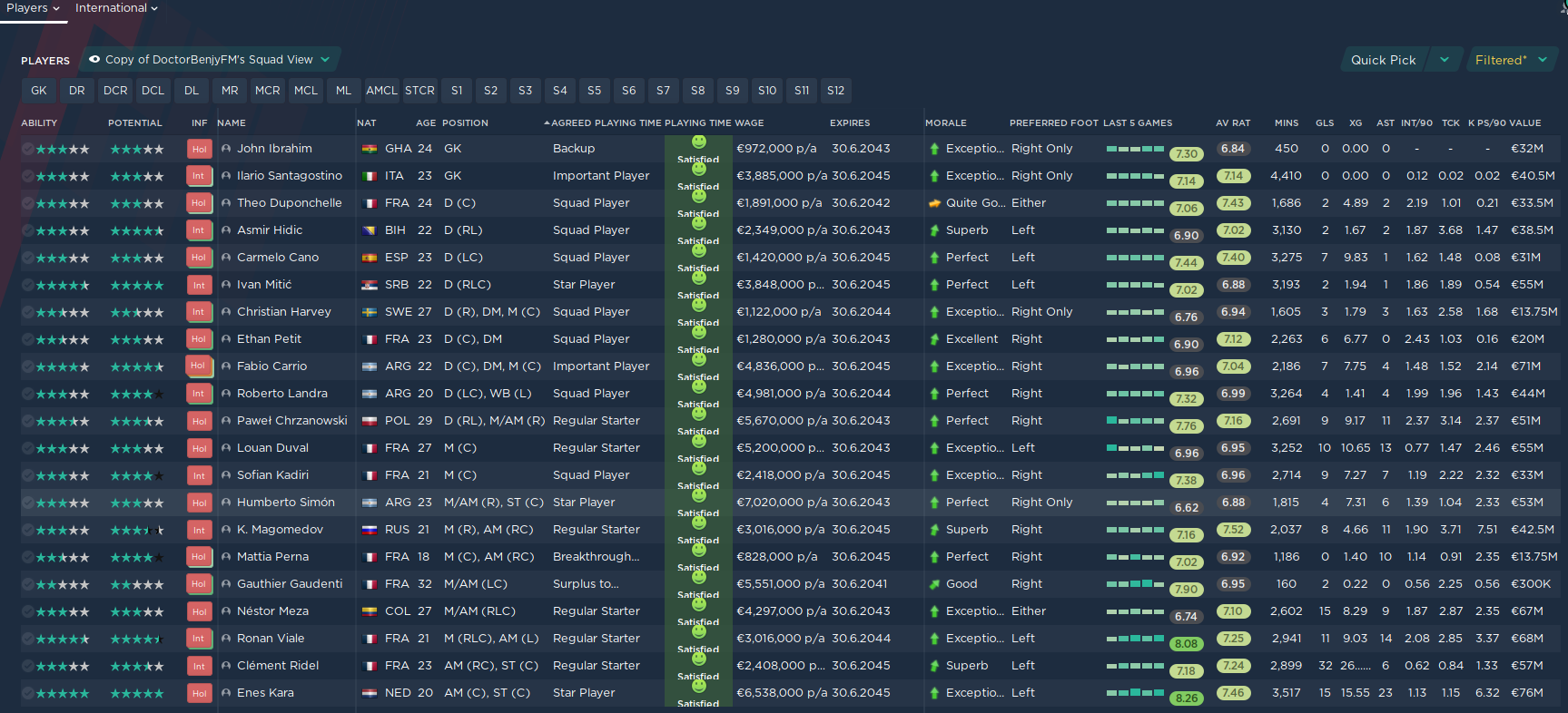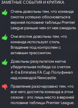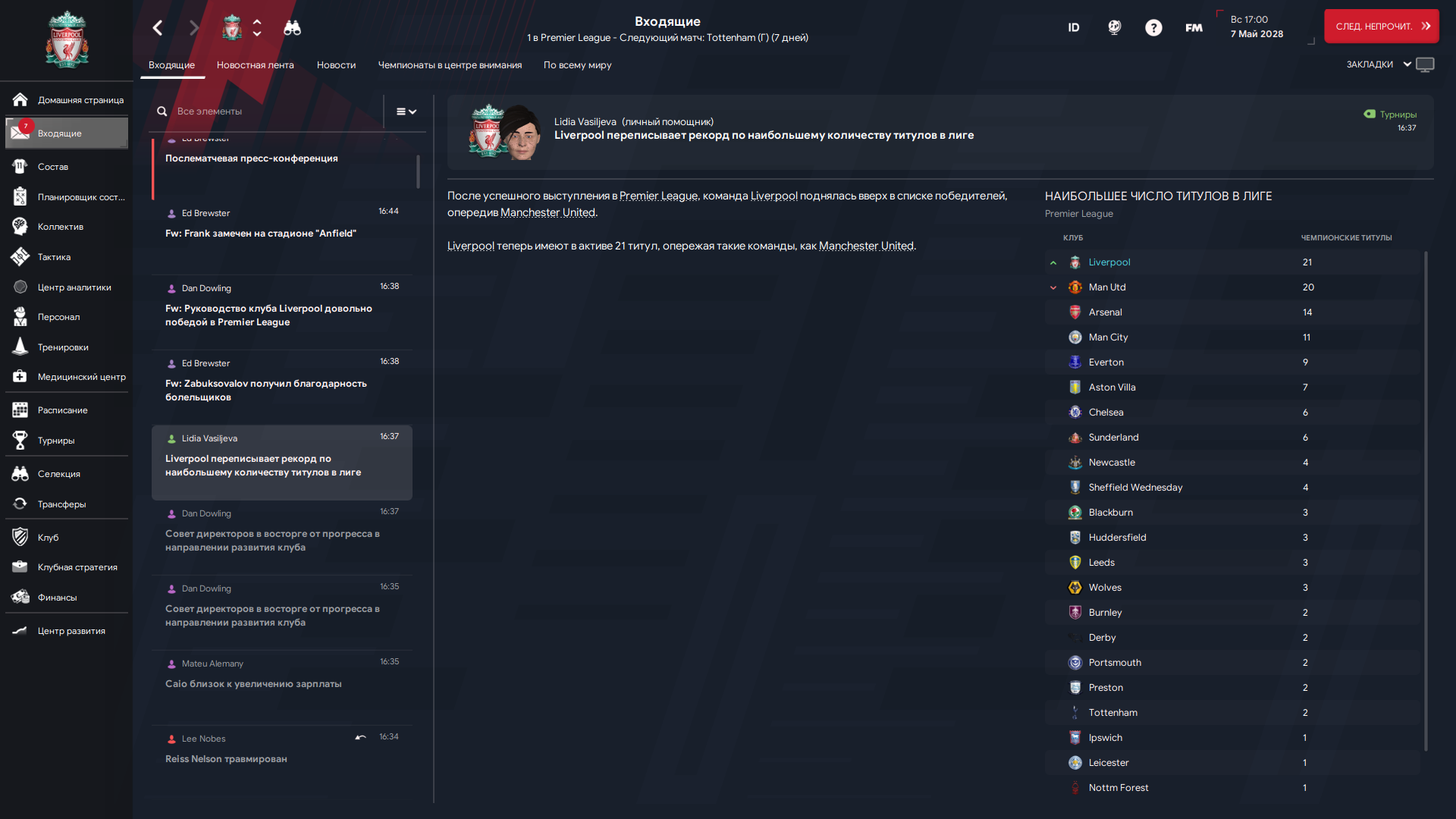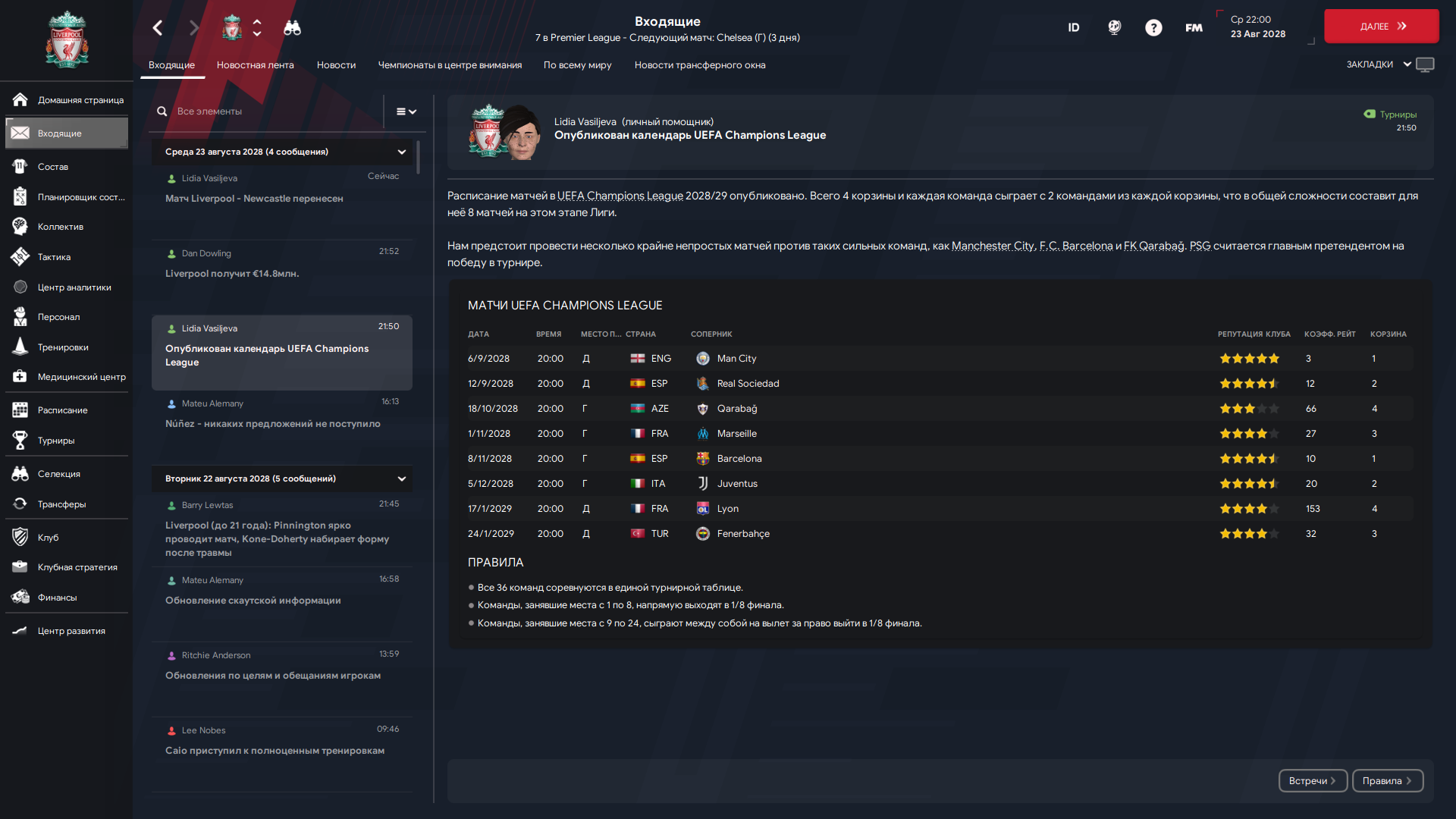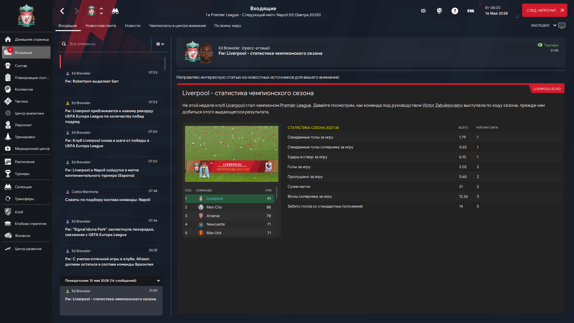 откатал 13-ый по счету сезон. итоговая таблица АПЕЛЕ, результаты матчей. из позитивного: каким-то хуем зацепились за ЛЧ в финале обыграв ПСЖ. по ходу сезона мне уже дважды приходилось играть против них и особых проблем мы тогда не испытали. на финал выходил со стойким ощущением неизбежной победы. сколько таких ощущений по ходу сезона ФМ заставил меня проглотить и умыться. я уж было подумал что скрипт выводит меня на финал против Лацио, т.к. в 1/2 ПСЖ достались именно римляне. вообще путь до финала это сплошной валидол. сначала 1/8 с Бенфикой, где в первом матче к 70-ой минуте мы вели 0-3 в гостях, а к 90-ой счет был уже 4-3 и только гол на 90+3 позволил увезти из Лиссабона хотя бы ничью. на третий день после шоковой терапии в Лиссабоне, моей нервной системе было суждено пережить еще один триллер в финале кубка Carabao против МЮ. 2-2 в основное, на 92-ой МЮ выходит вперед едва успели начаться овертаймы. спустя 2 минуты счет сравнивает герой этого матча Greg Hilson, который до конца второго овертайма отгружает еще двушку и в конечном итоге записывает на свой счет покер. после этого начался валидольный отрезок матчей "на тоненького" где победы с разницей в один мяч выгрызались зубами. снова Атлетико, снова Реал. в той же последовательности что и в прошлом году. кое-как со скрипом сдюжили и оказались в финале. в самой АПЛ как уже и говорил ранее плотность просто ебейшая. за 4 тура до конца святые шли на 2 месте в итоге оказавшись 7-ми))))) на вторую/третью строчки претендуют сразу 9 команд. надеюсь победа в ЛЧ даст мне иммунитет к увольнению при хуёвых результатах, потому что в планах продолжать ломать и строить сызнова, что непременно скажется на результатах.