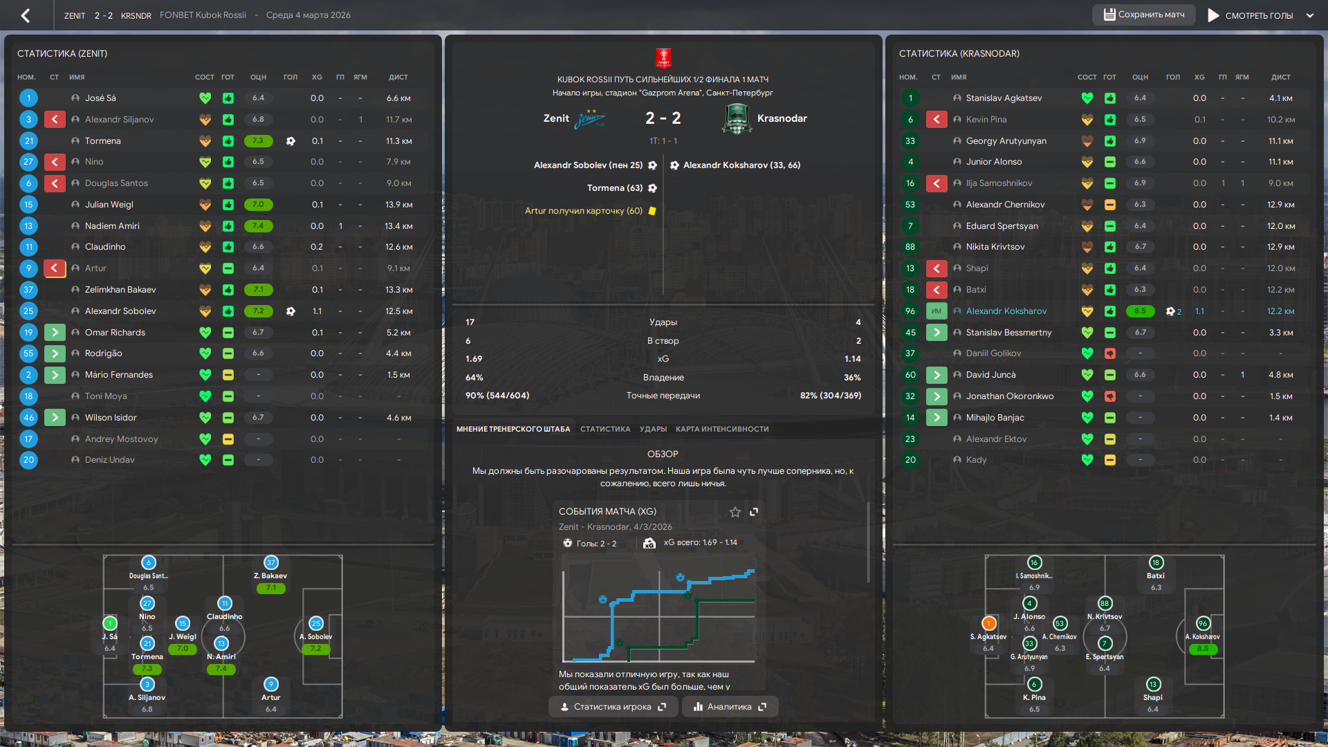 Что с цскалом в четвертухе 1-0, 0-1 и пенальти, что с Краснодаром по 2 гола с 2 ударов в створ, благо каким-то чудом дожали второй, перевели на пенки, где наш вратарь, сыгравший матч на 6.3, вновь проявил себя как босс игры.