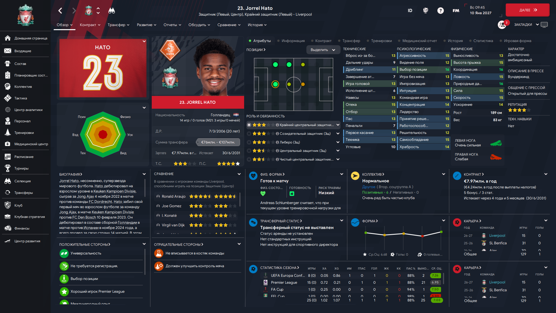 Был куплен ещё Клоппом летом 2024, как прощальный подарок Ливерулю, уже в сентябре при Хаби улетел на 3 месяца с позвоночником, но вернулся и взял чемпионство! С тех пор, тьфу-тьфу, почти не ломается на долгий срок - в августе только вот на 2 месяца вылетал сейчас, а до этого всё окей, в сезоне 25/26 пропустил всего 2 недели. Надеемся на лучшее. За такие-то деньги блять, только надеяться и верить.