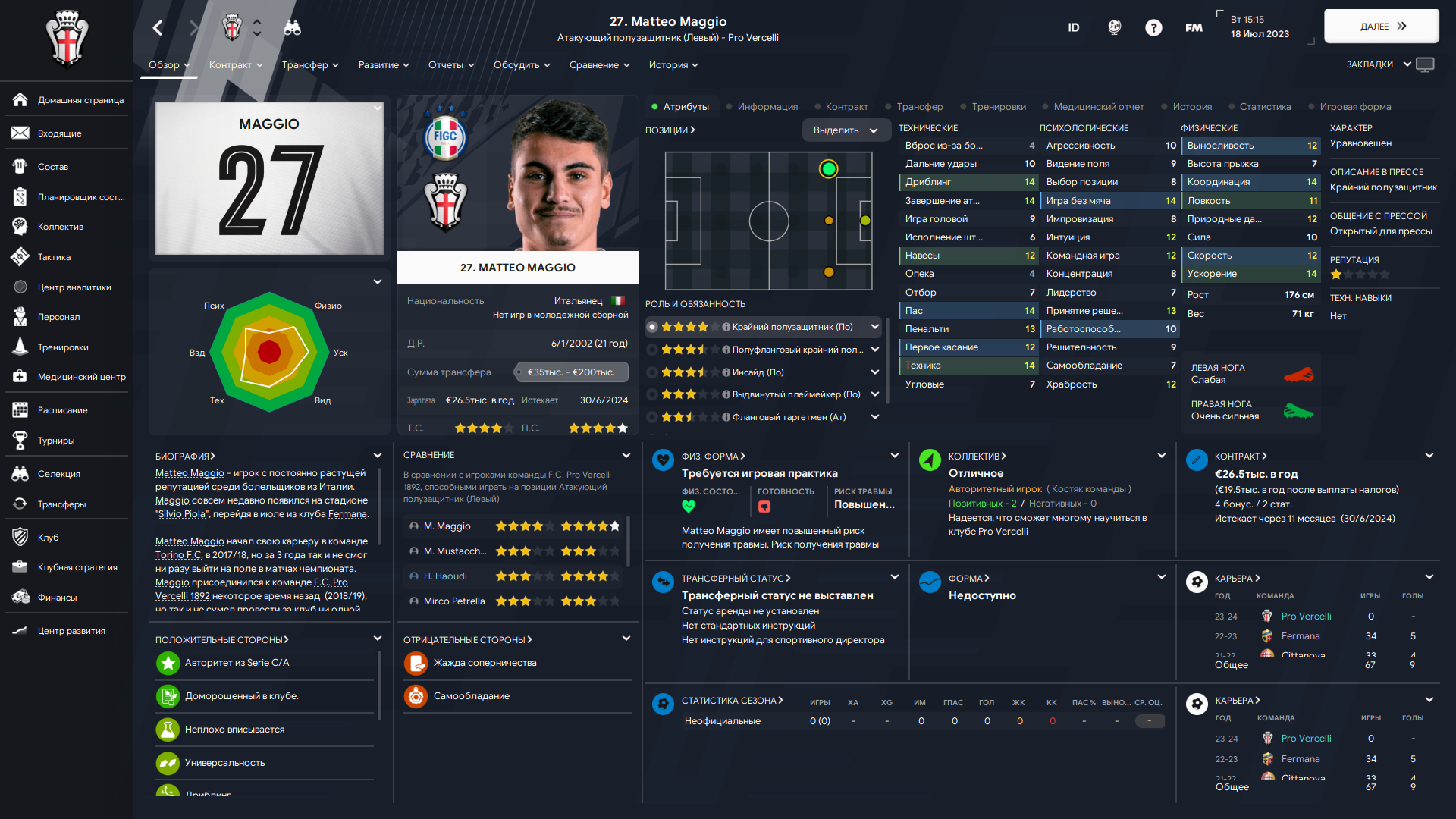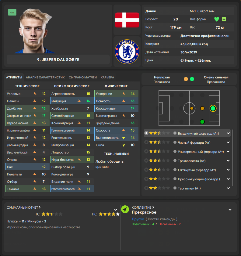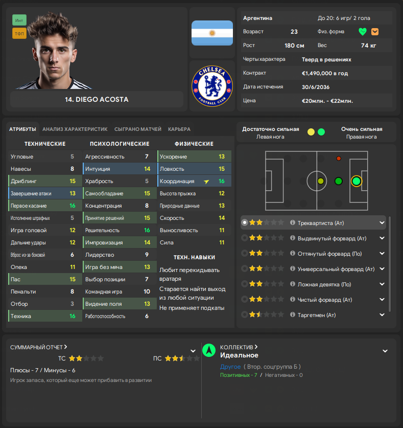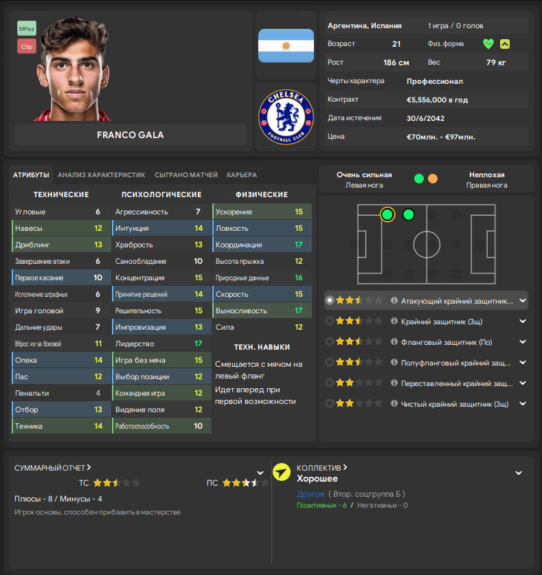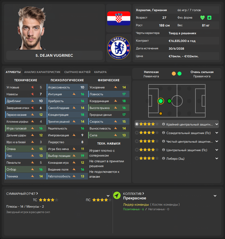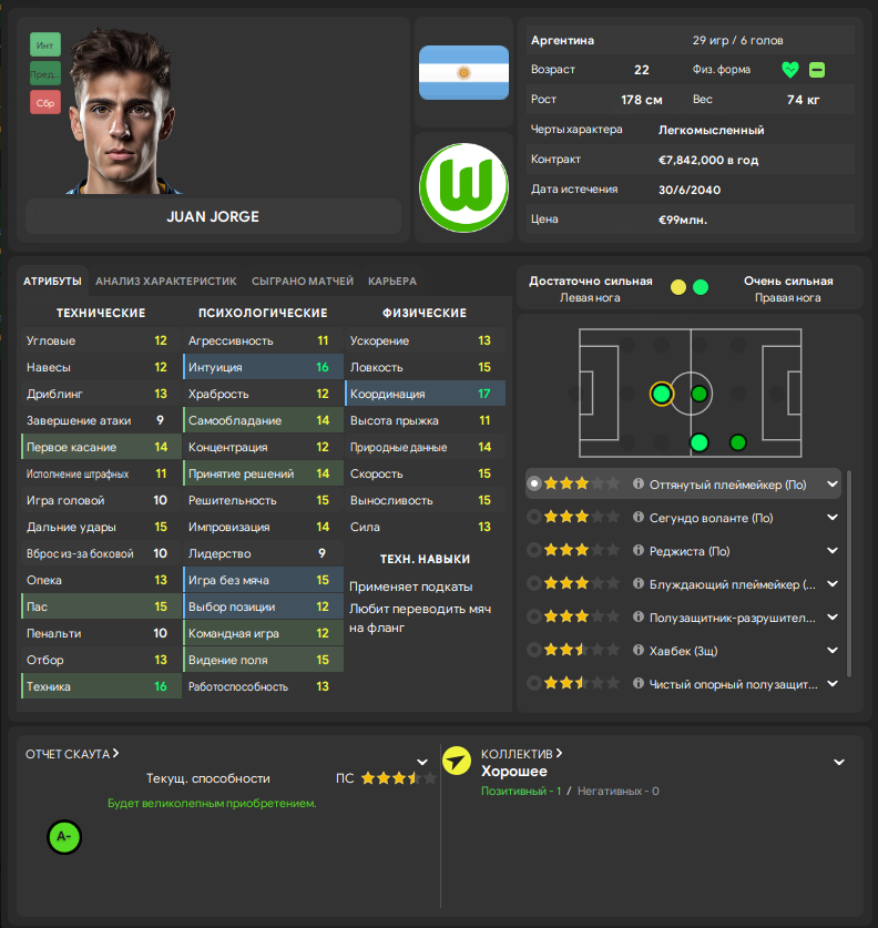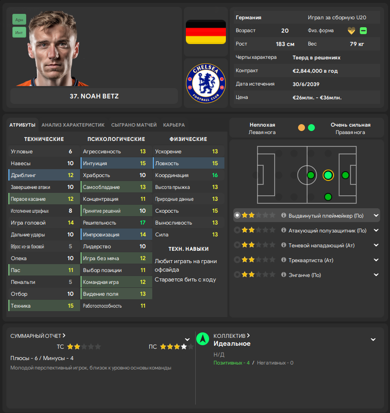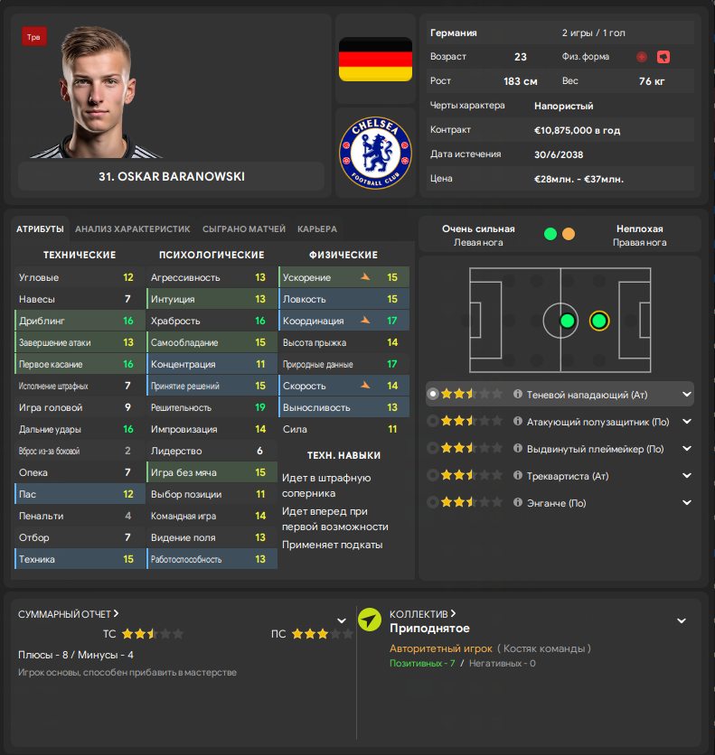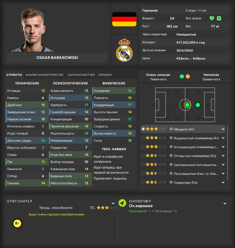 С разрывом подколенного будет отдыхать ещё пару месяцев, пропустил вторую половину сезона 23/24 с ахиллом, благо хоть десятку всего получает. Да и диспетчером его хуй назовёшь с 5 голевыми за 3 сезона, да короче не знаю, ну скиллы неплохие, если эта закуска венгерская наконец вылечит свои кривульки, то пошумит, думаю.