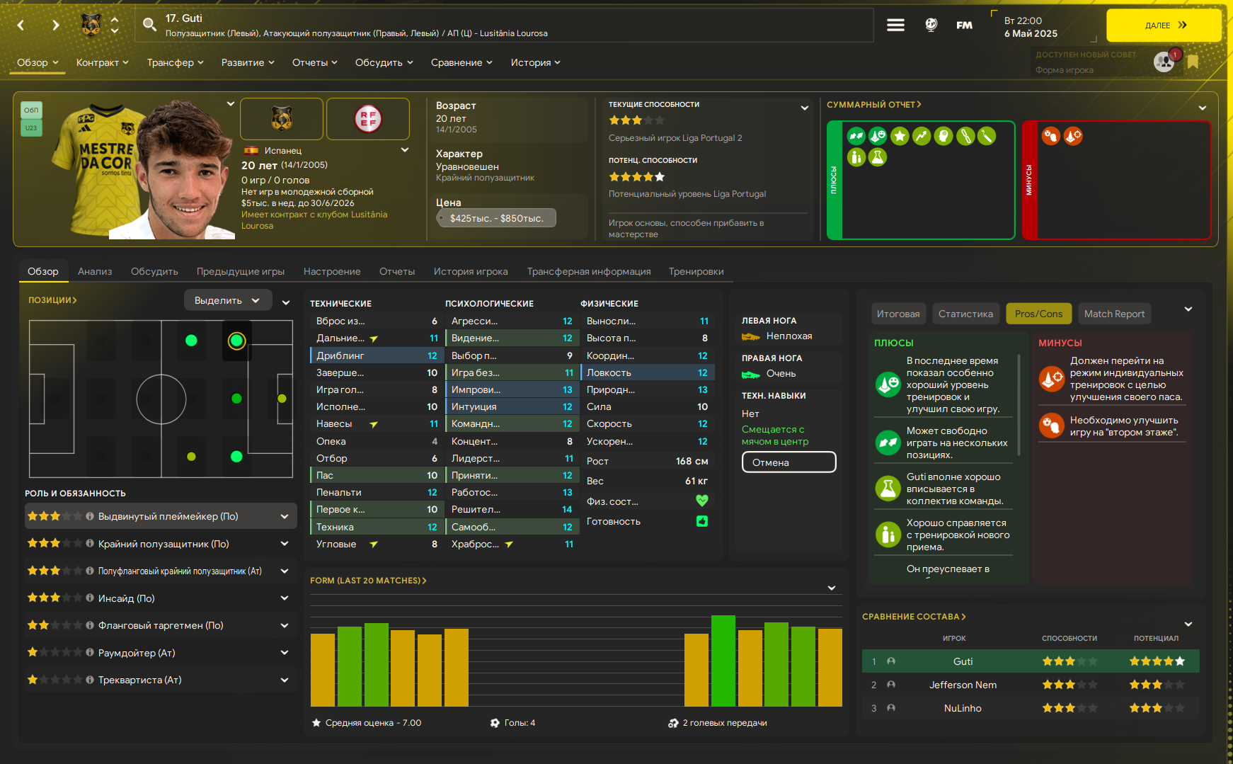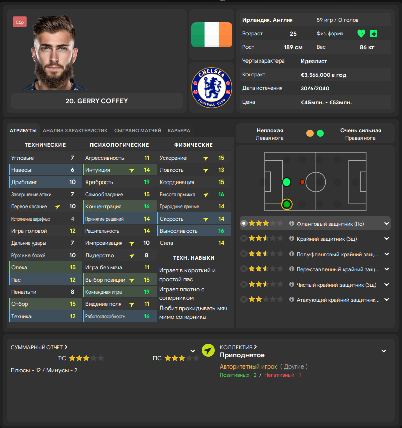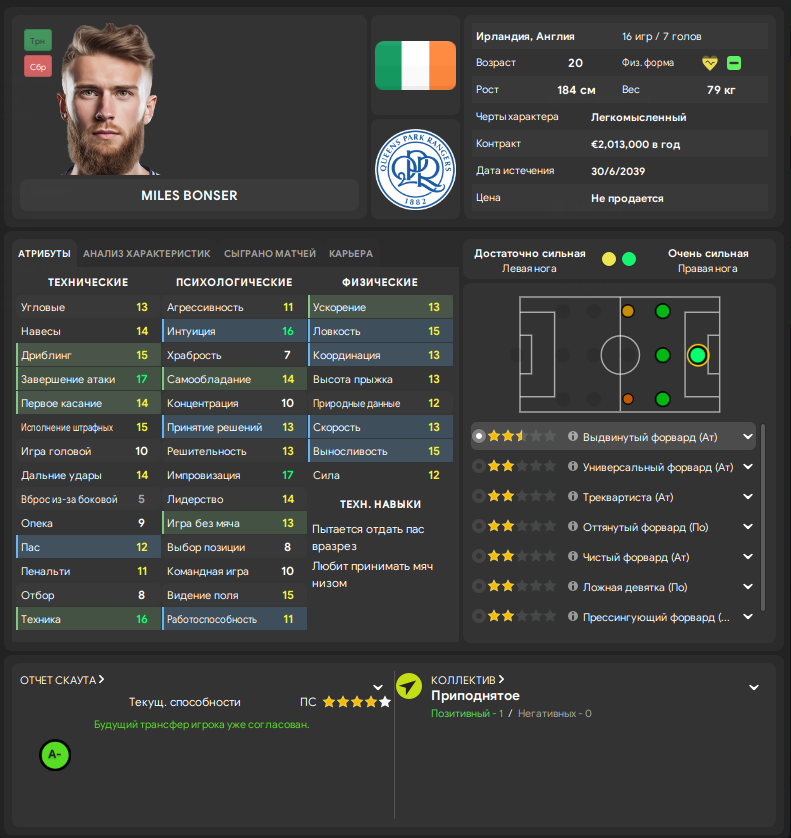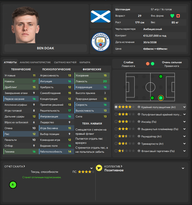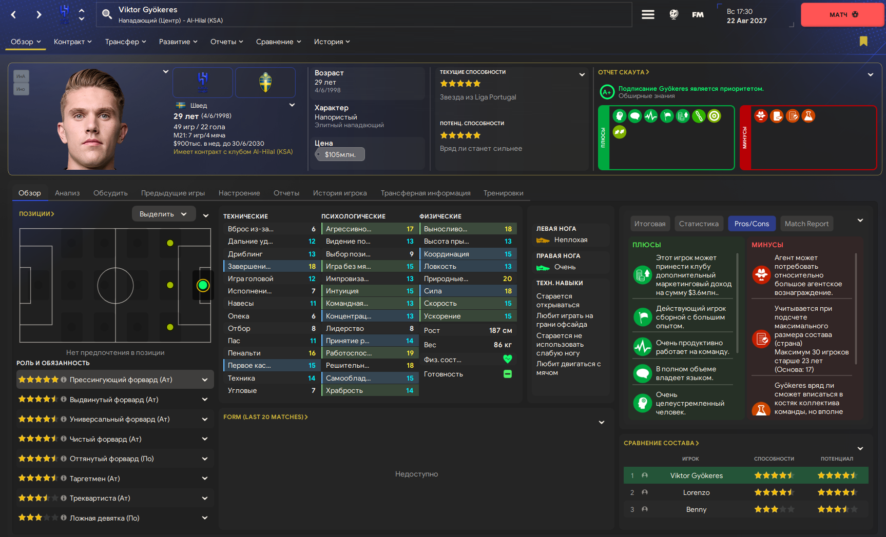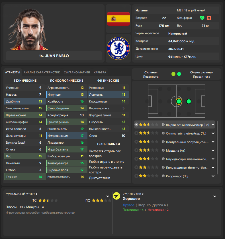 С разрывом подколенного будет отдыхать ещё пару месяцев, пропустил вторую половину сезона 23/24 с ахиллом, благо хоть десятку всего получает. Да и диспетчером его хуй назовёшь с 5 голевыми за 3 сезона, да короче не знаю, ну скиллы неплохие, если эта закуска венгерская наконец вылечит свои кривульки, то пошумит, думаю.