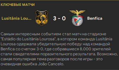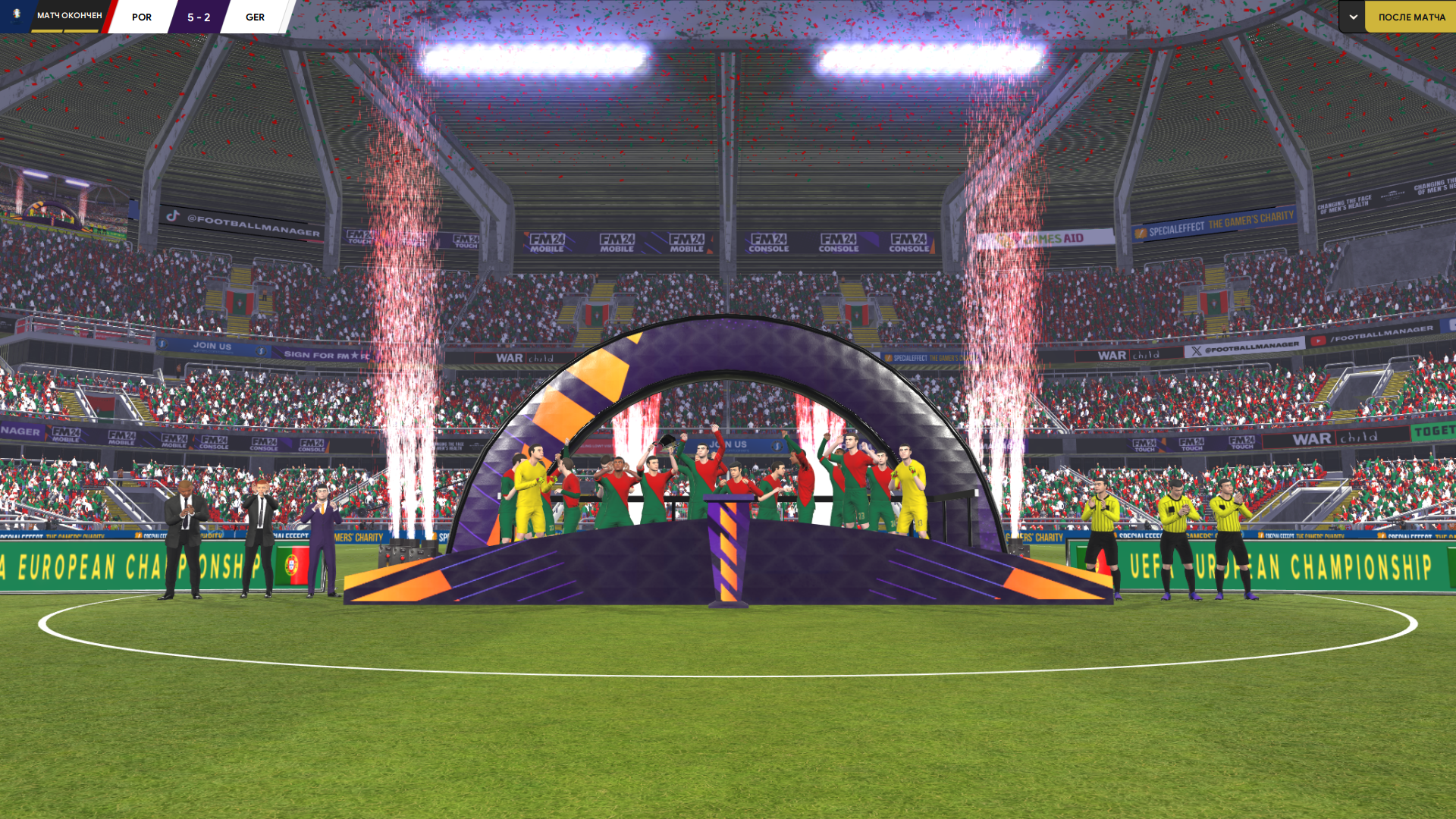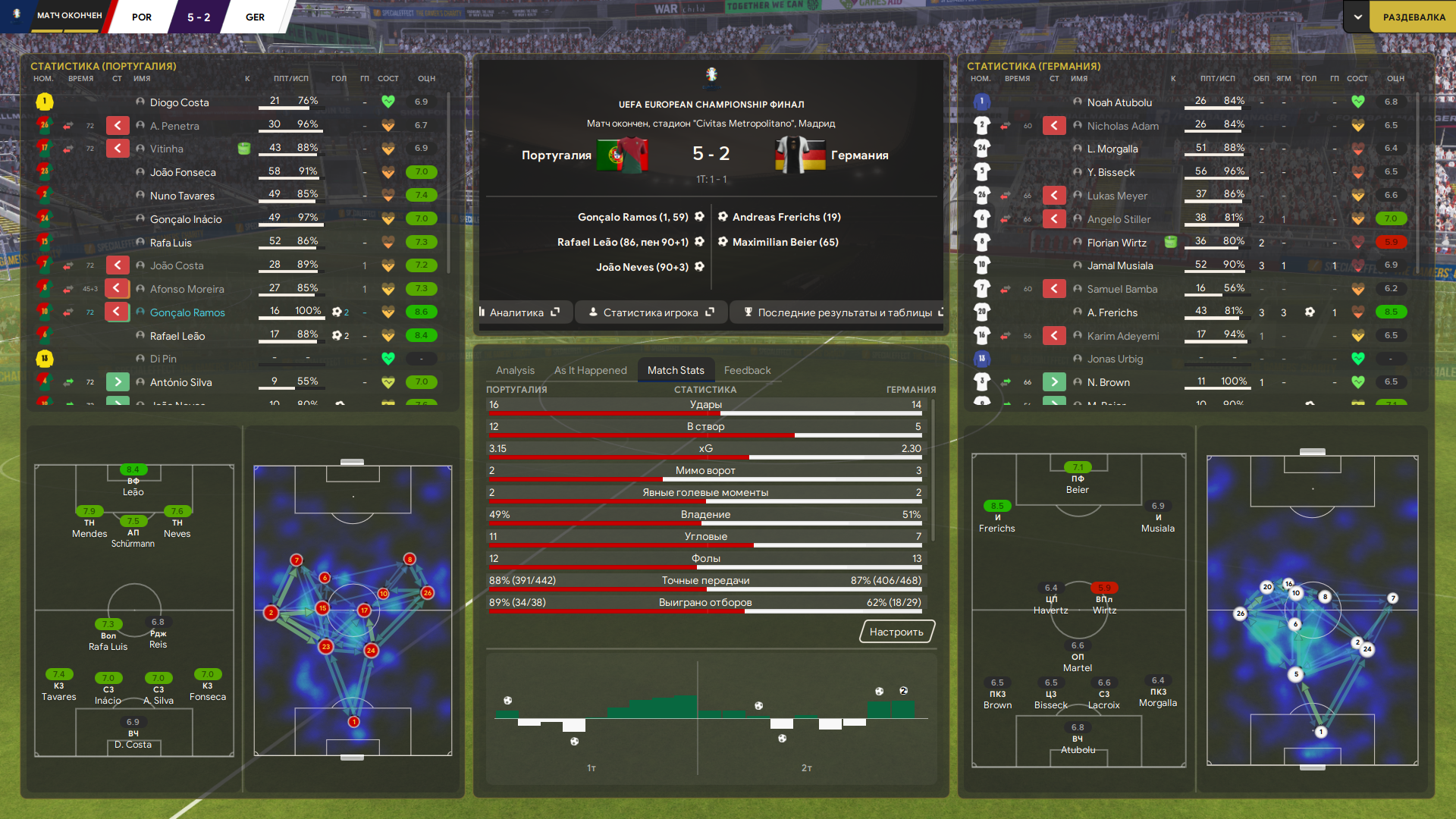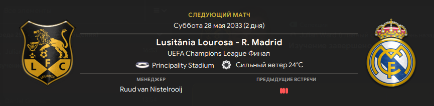 >>3349159 Переключаемся тоже на заранее подготовленную елочку, чтобы сохранить эффективность прессинга и не давать оппоненту много времени на мяче, но реал все-равно показывает несколько быстрых и опасных розыгрышей буквально в касание. В том числе благодаря свежим заменам. Но наши замены сыграли лучше - Вот этот >>3346430 японский колобок, которого в начале сезона таки выгнал ПСЖ за смешные 4 ляма, приехал в Португалию, стал тут лучшим бомбардиром и, выйдя на замену в финале ЛЧ, похоронил шансы Реала на отыгрыш. 2:0 и скромный португальский клуб Лузитания Лороза берет ушастого на 10 сезон.