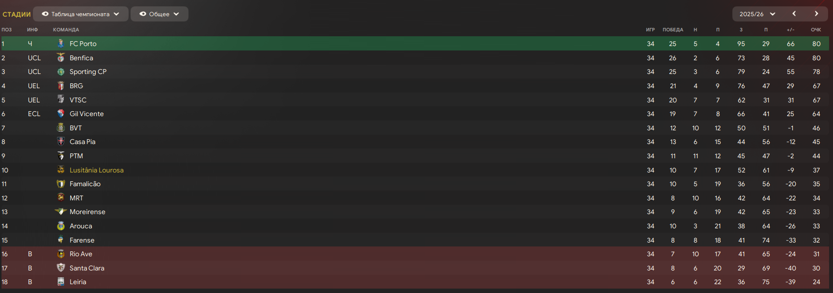 Сейчас мы идём по сути на 7-12 местах ещё с несколькими клубами, а вот до лигаевропейского 6 места ещё сосать и сосать, благо в этом году мы играем в Лиге Конференций, которую обязаны выиграть, и за победу в которой дают прямой инвайт в Лигу Европы. Так что должны подняться на ступень выше в этой иерархии еврокубков.