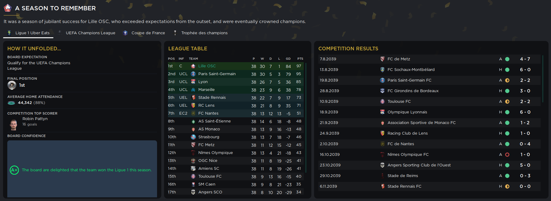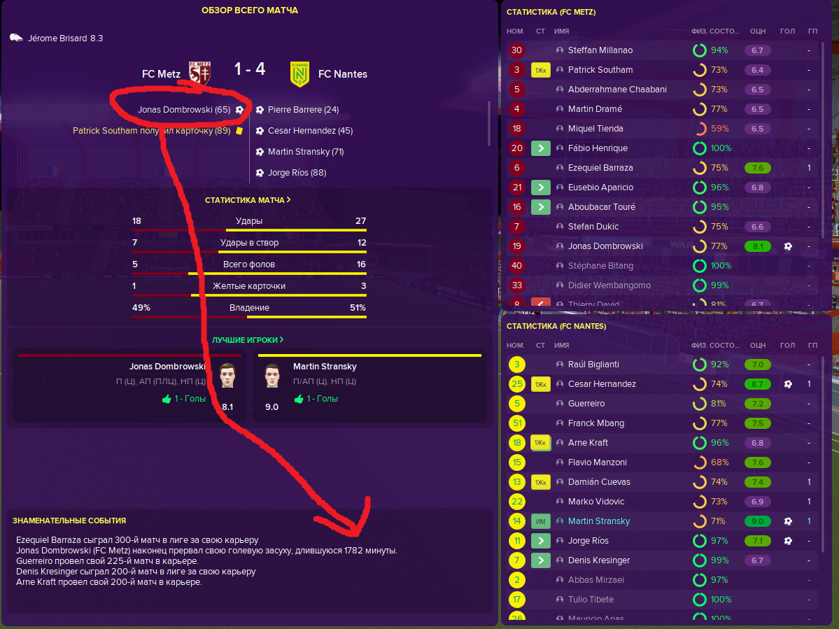 >>3347646 Ну вот и все, ребят. Мы взяли чемпионство, прыгнули выше головы, команда просто пушка, кипера бы только топового, а то много напропускали (8 только от псж). Если кто хочет попробовать могу скинуть сэйвы версия 20.4.4, псж с аллегри дико силен, они в 3 раз в истории закончили сезон с 0 поражений. Не смотрите на разницу мечей сэнт-этьена, я случайно включил читы и мы "победили" в матче с ними со счетом 34-1, хотя на деле проиграли 1-2, я их гол один отменил, но игра все запомнила. Рекорд по победам (была 21), рекорд по забитым мячам (119 минус 33 = 86 забили, как и псж, жаль не обогнали), по количеству набранных очков тоже. Это были замечательные 18 сезонов в Нанте, как мы вытаскивали сезоны со дна, в чемпионате на 10 месте, но в еврочашках выносим всех, играл в режиме айрон мэн, без загрузки сохранений, чисто как идет. Хочу удалить после 401ч наигранного, поставить следующую версию, взять псж и разок пройти сезон, попылить в лч, оформить чемпионство и по дружески слить два матча Нанту. Всем Лудогорец!!!
