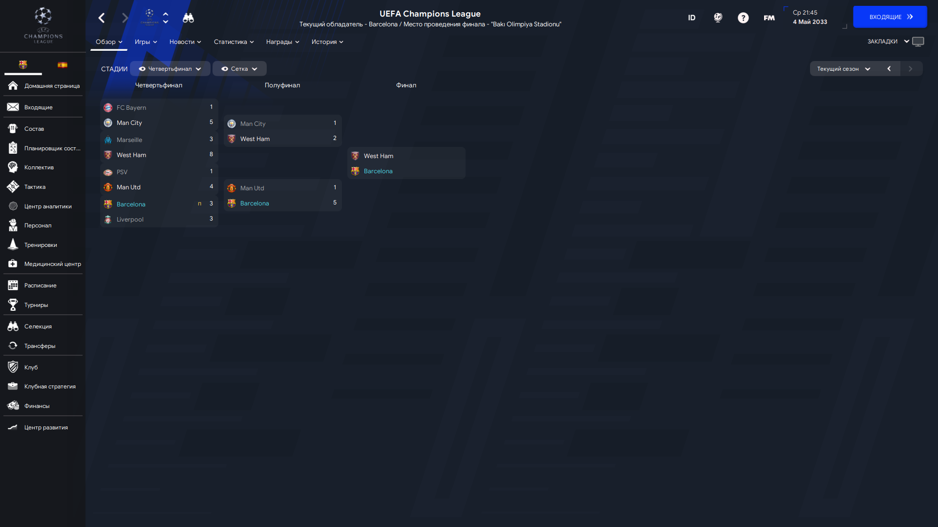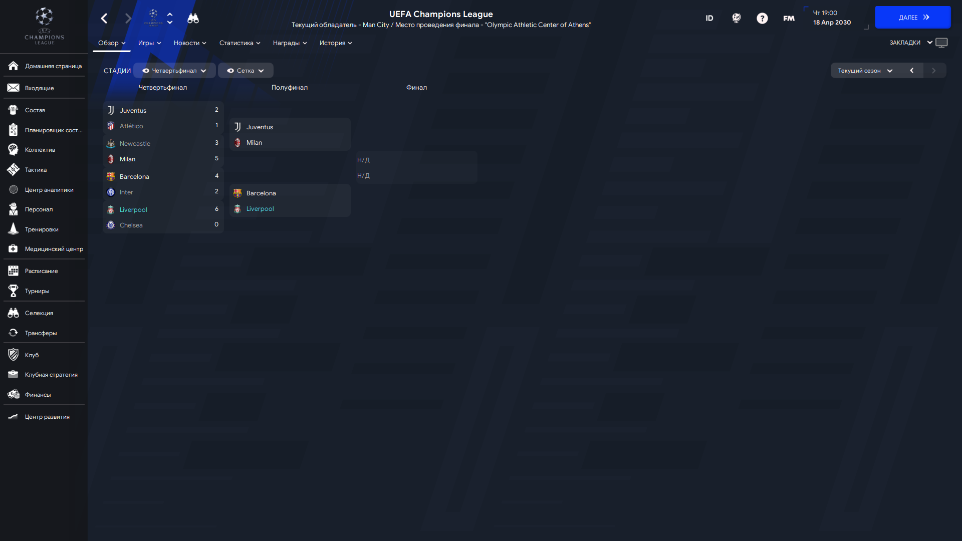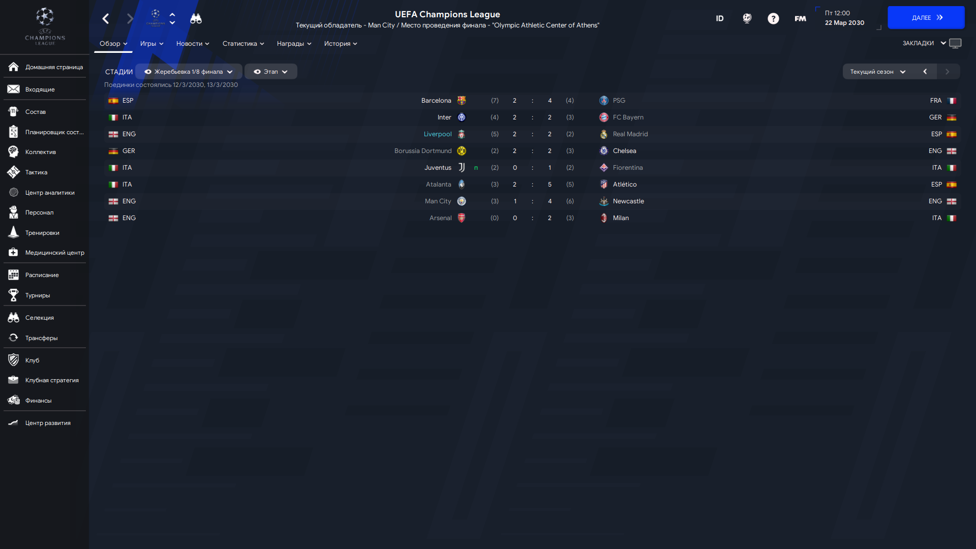 >>3346499 Ставка на проход в 1/8 сработала, получается. Плюс я немного оптимизировал тактики против сильных соперников и местами вышло гораздо лучше. Ну и повезло нарваться именно на итальянские команды. Они куда мягче, чем испанские или английские. Особенно понравился ответный домашний матч против Интера, которым командует Гвардиола. Там же в составе нашелся Руни Барджи. Шведский месси и испанский Гвардиола нашли друг-друга.