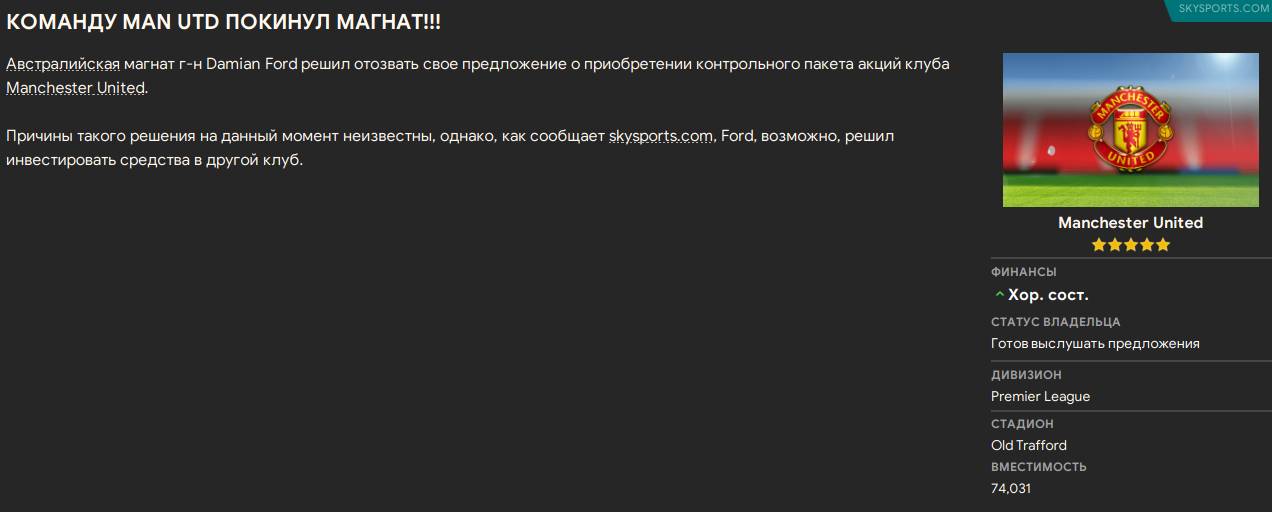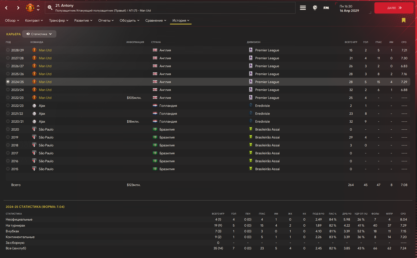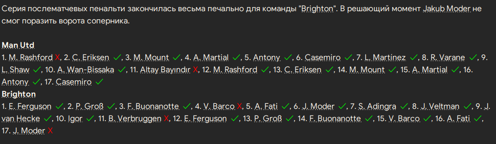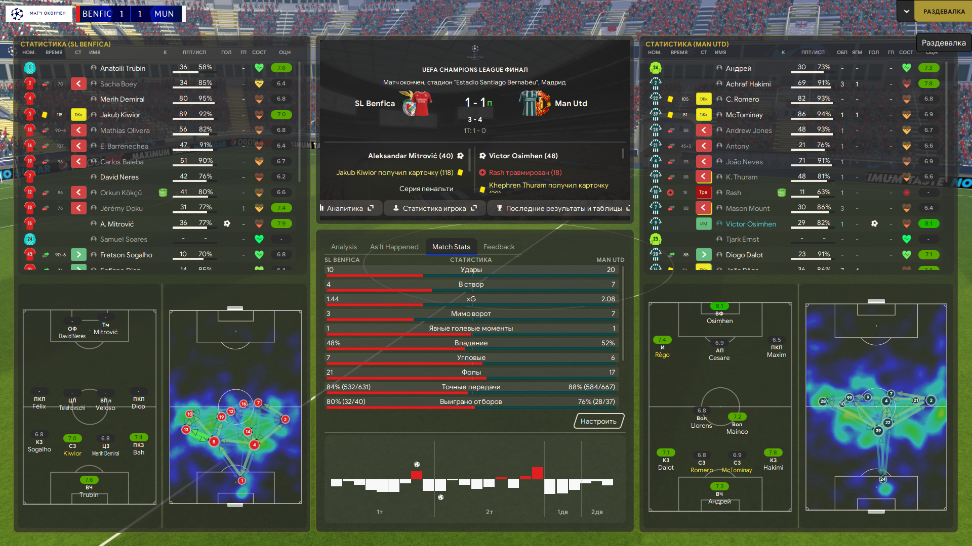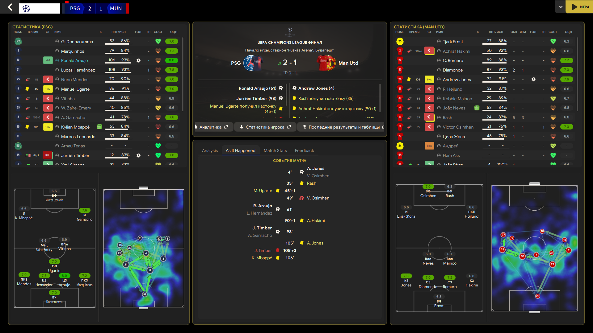 Второй подряд финал против ПСЖопы, в котором мы обосрались. Наш немолодой талисман и тащер Андре Онана был сломан, вместо него играл какой-то резервист с фамилией Эрнст, который пропустил в очко с почти нулевого угла от Тимбера. После такого можно и вратарскую карьеру закончить. Мой любимый игрок (после Тюрама и Олисе) Мэйсон Маунт тоже отправился на больничку прямо перед финалом. И ведь это был последний матч для легенды МЮ - Маркуса Рэшфорда. Хотел его еще в начале сезона продать, но тогда он валялся со сломанной ногой и никому не был нужен. А теперь уедет на восток бесплатно.