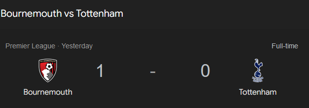 вчера негры борнмута должны были забивать 10 голов но проебали все свои стопроцентные моменты. любой околотоп всегда за это накажет, но тотенхем вышел просто сливать матч.