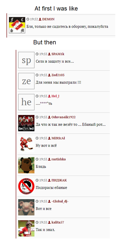 >>3208967 пятое подряд чемпионство никогда не будет чувствоваться так остро, как тот же 2007 год так что приходится искать удовольствие в баттхерте москвачурок и им подсасывающим