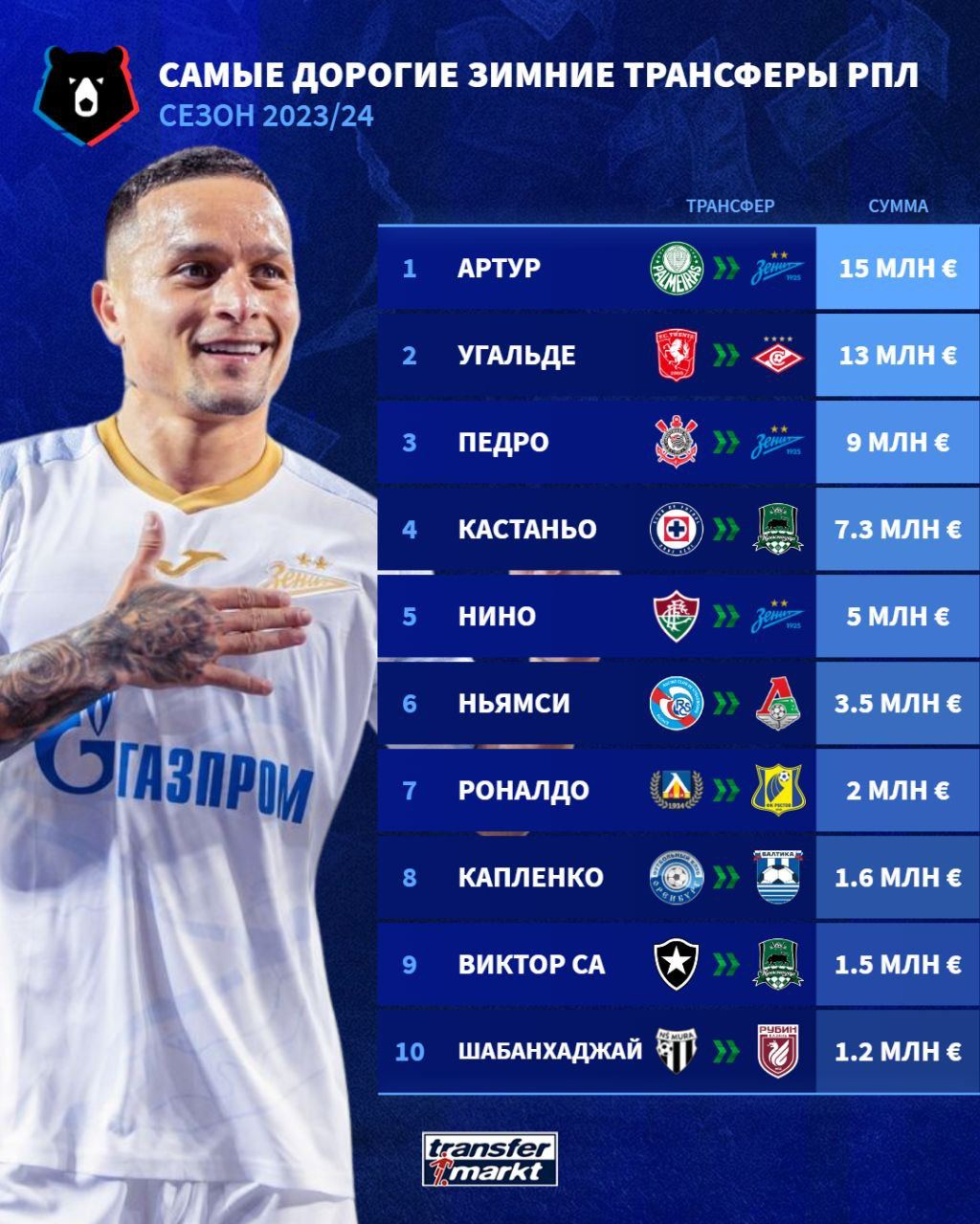 Трансферный баланс «Зенита» за последние 5 лет – минус 126 млн евро. Далее среди российских клубов располагаются «Спартак» (минус 81 млн), «Локомотив» (минус 64 млн), «Динамо» (минус 63 млн), «Краснодар» (минус 63 млн) и ЦСКА (минус 10 млн).