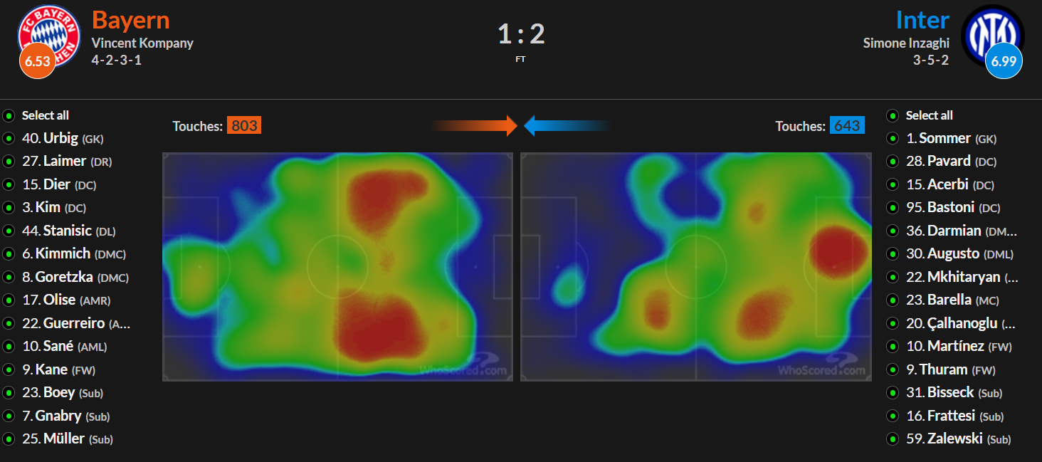 Бавария не жмётся. Сначала Олисе чуть не добежал до штрафной, теперь мяч забрали. Индзаги орёт как ненормальный такое дело ему не нравится. Тут же Олисе на стероидах - сантиметры от штанги, а если бы забил... Пока что очень круто!