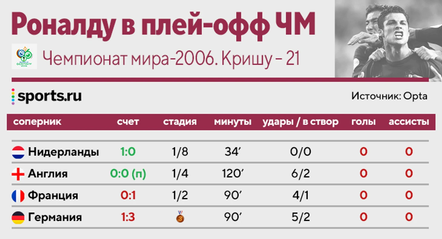 На ЧМ-2006 у Криштиану 25 ударов без учета пенальти (15 в плей-офф) и 0 голов с игры − худший результат на турнире.