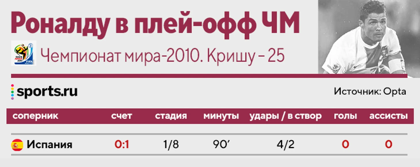 Конечно, все помнят, что Криштиану играл на чемпионате мира в Германии. Правда, не благодаря голам, а из-за стычки с Руни в четвертьфинале, после которой англичанина удалили. Но в том матче Криш единственный раз забил в плей-офф − закрыл серию послематчевых пенальти.