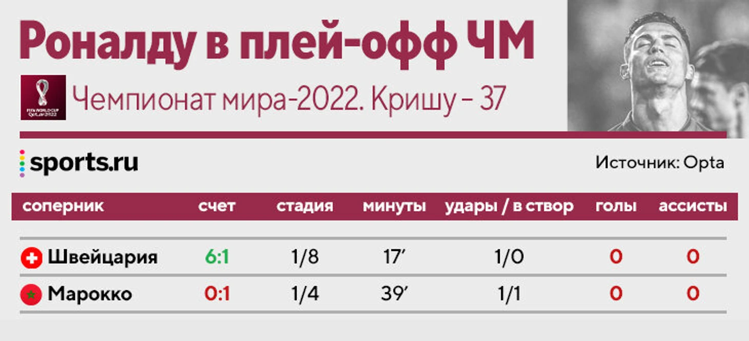 В плей-офф ЧМ-2022 Роналду оказался запасным: выходил при счете 5:1 в матче со Швейцарией, чтобы основа отдохнула, и спасать матч с Марокко. Не получилось