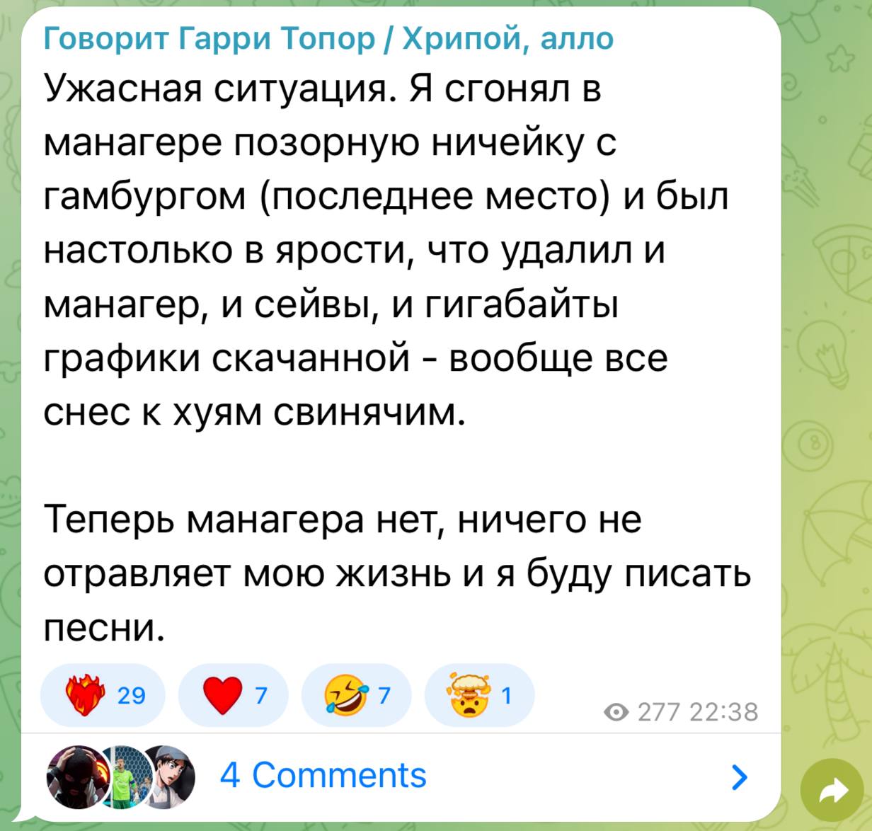 >>3398741 ненавижу нытиков особенно в начале сейва приходится всем уступать, потому что уже выучил, что сказать, чтоб стрелочка не падала но иногда есть уебки, которые изноются, чтоб съебать в какую нибудь залупу итальянскую из 2й половины таблицы у меня вот был талант из ирландии, который возомнил себя звездой клуба, когда довбик ушел я не отпустил его в мю за 3 копейки, он начал вонять в итоге продал его в данди юнайтед, но тоже же юнайтед и он прошлый сезон даже половины игр в основе не отыграл люблю наблюдать как сложилась судьба моих игрочишек спустя годы
