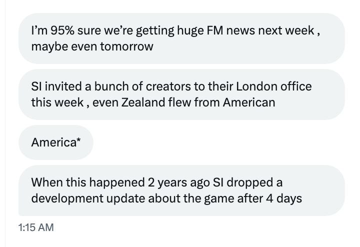 Но наша работа над тренировочным модом не прекращается, и мы активно работаем над выпуском большого патча для решения проблемы, которую обнаружили случайно и которую до сих пор удивляет, что SI так и не исправил. Мы усердно работаем над тем, чтобы игра распознавала, что в мире футбола еженедельное расписание должно включать футбольные матчи, которые проходят в любой будний день, кроме субботы. По неизвестным нам причинам тренировочная система была построена с учётом того, что футбольный матч проходит только в субботу или во вторник. Ничто в коде не указывает игре на то, что игры проходят в воскресенье, пятницу, среду и четверг. Или даже в понедельник.
