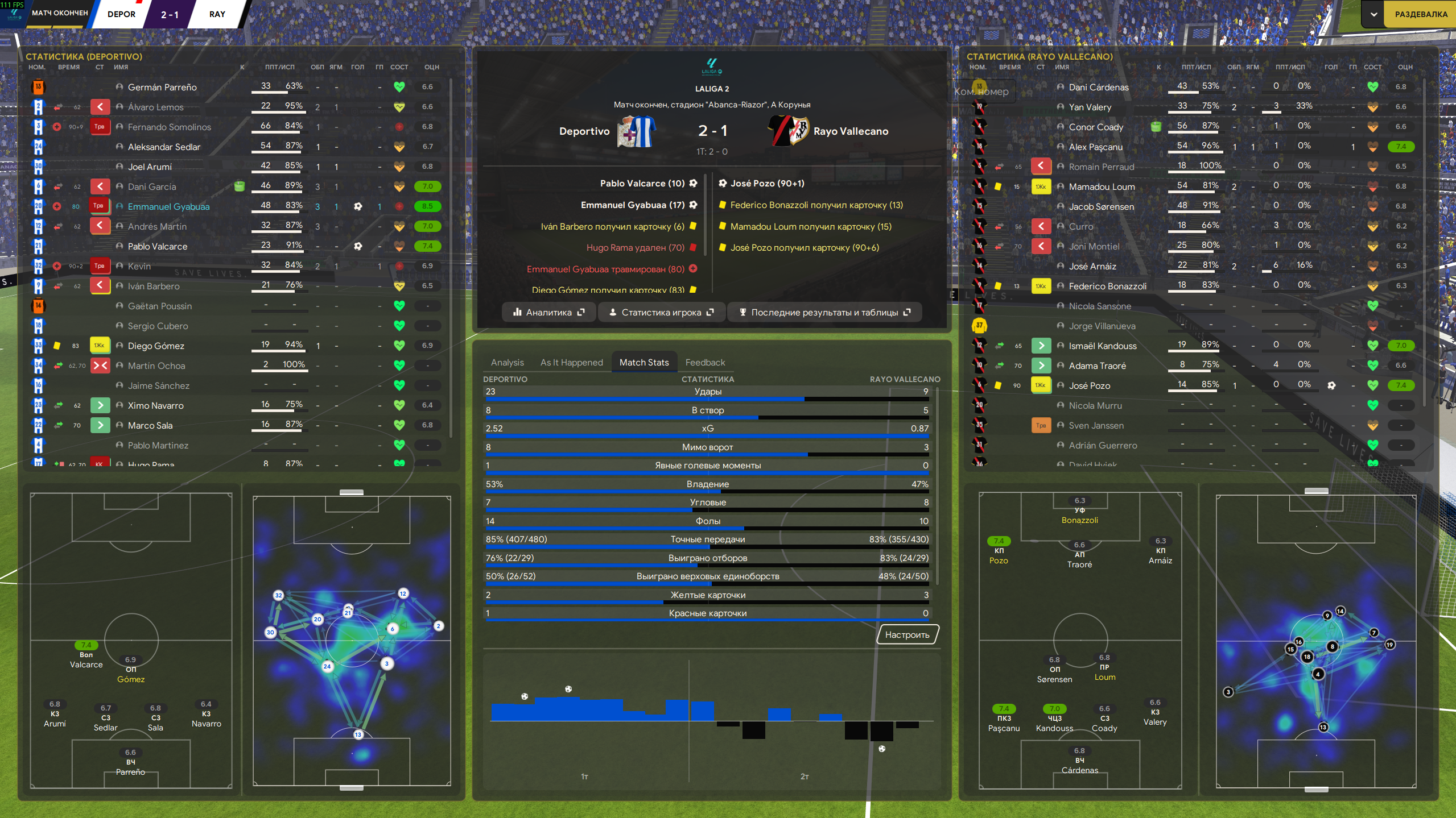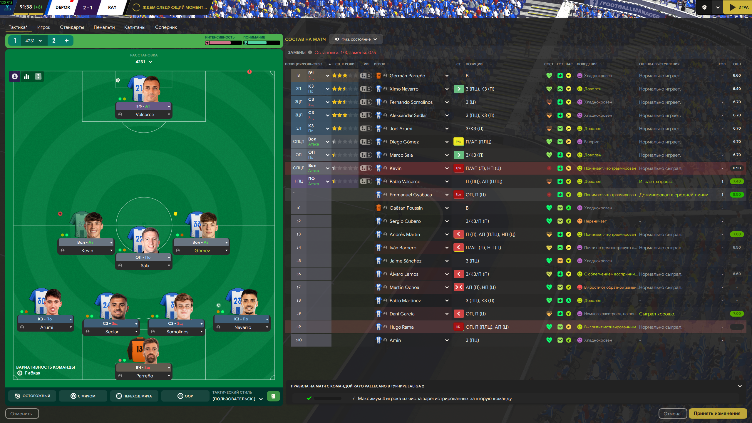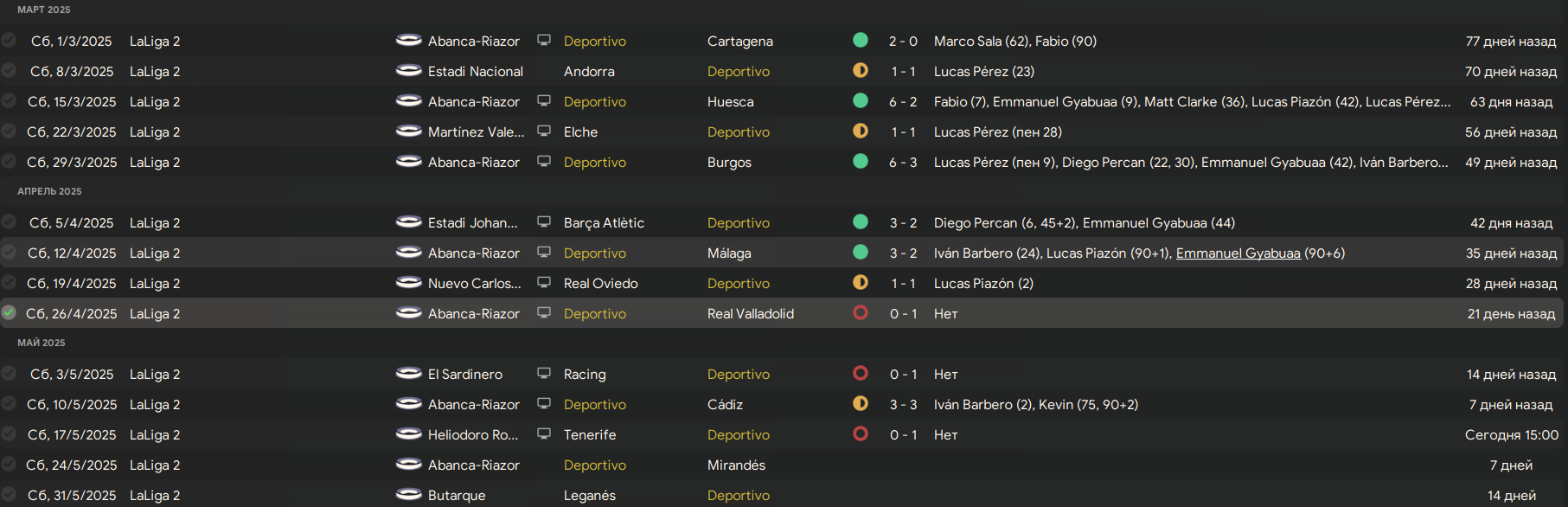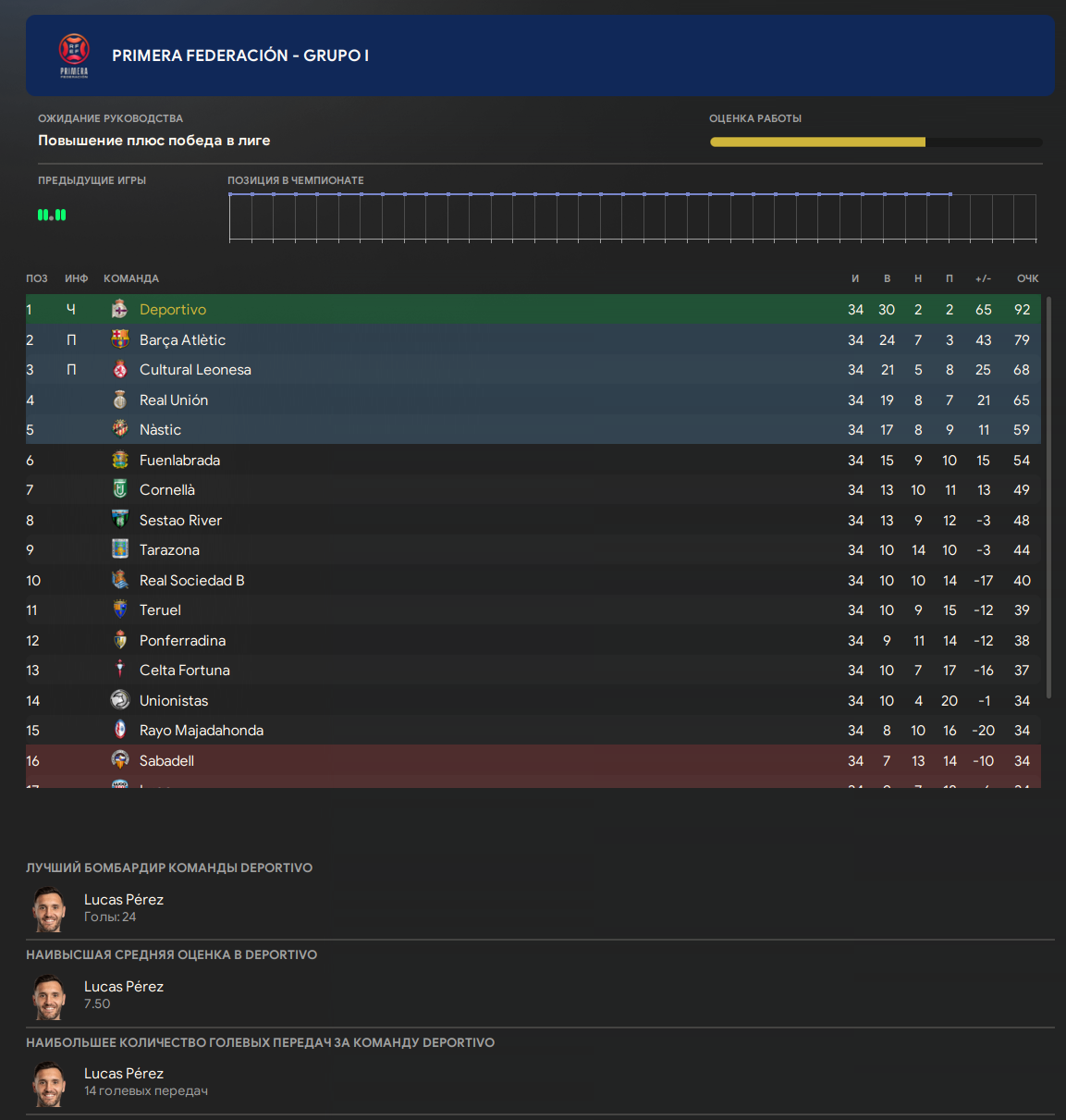Депортиво вернулся в Ла Лигу, но какой ценой... Имея хуевый переломанный состав, играя кучу валидольных матчей с камбеками и неожиданными концовками, смогли залезть и закрепиться в лидерах таблицы, до конца борясь за лидерство с Вальядолидом. Но в момент когда нам обьявили что команда точно вышла в высший испанский дивизион - игроки забили на все хуй, из-за чего нам не получилось побороться за чемпионство. Будем выходить с обоссанного второго места, к сожалению.