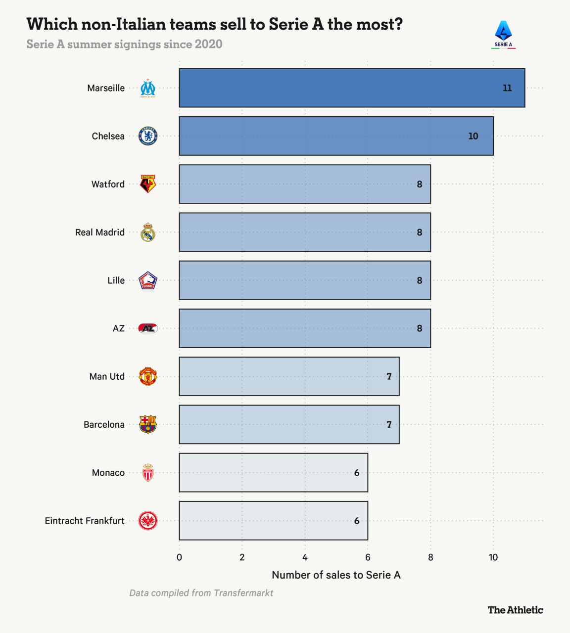 🇮🇹 Если вынести за скобки внутреннюю миграцию футболистов, в Италии превалируют сделки с французскими клубами. «Марсель» – главный донор для коллективов из Серии А.