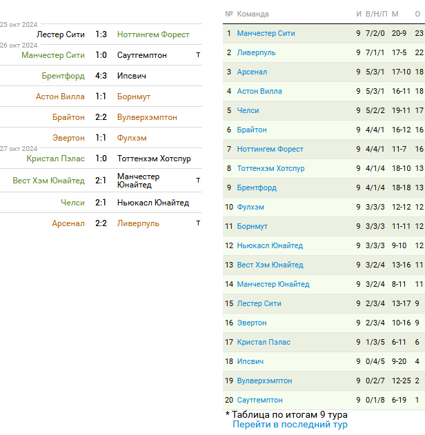 Ливерпуль: 1 тур забил первым (вин) 2 тур забил первым (вин) 3 тур забил первым (вин) 4 тур забил первым (вин) 5 тур забил первым (вин) 6 тур пропустил первым (луз) 7 тур пропустил первым (луз) 8 тур пропустил первым (луз) 9 тур пропустил первым (луз?)
