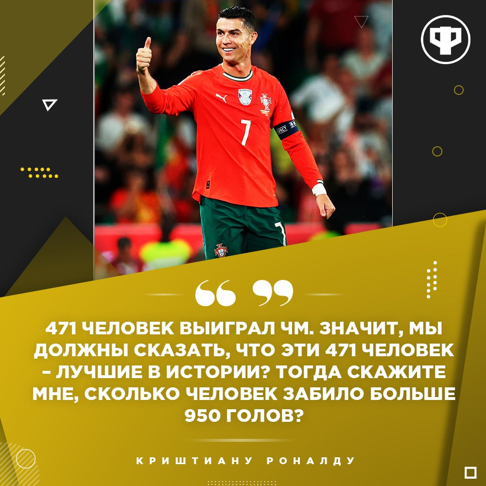 Не мечтаю о победе. Говорят: «Криштиану станет величайшим, если выиграет». Не согласен, у меня уже 3 трофея с Португалией. До Месси у Аргентины было 2 победы