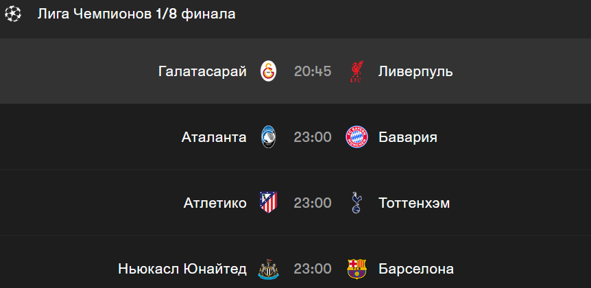 Ну че подбиваем итоге первого дня 1\8 Ливерпуль обосрался с Галатасараем. Турецкий середняк оказался не по зубам маэстро Слопу. Бавария вопреки МОИМ ожидания уничтожила нахуй Аталанту. Прощай Серия А. Атлетико тупо прохалявил, Кариус-2 сделал половину матча. Барсу поздравляю с выцарапанной ничьей.