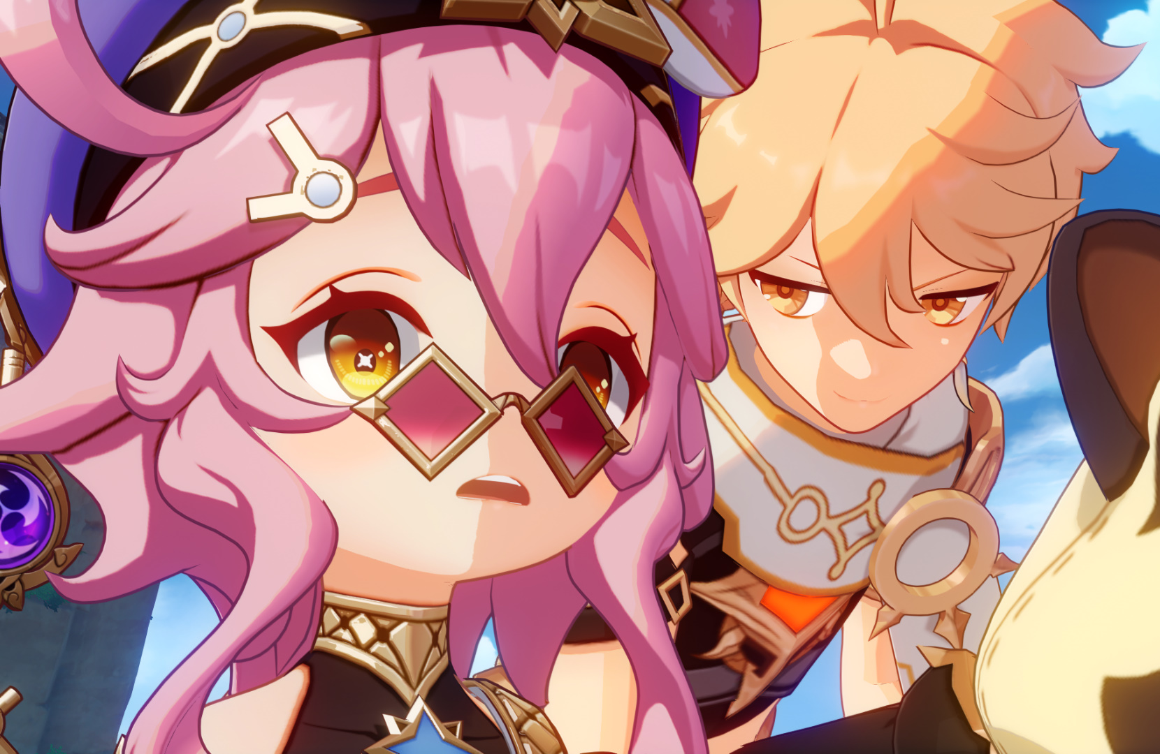 Якобы перерисованная сцена из аниме K-on, где девочки выступают на сцене. Вместо Юи - Навия (Navia from Genshin) из Хоровод импакта. Электрогитара. На переднем плане. Вместо Мио - Эмилия (Emilie from Genshin) из Хоровод импакта. Бас-гитара. Вместо Азусы - Тиори (Chiori from Genshin) из Хоровод импакта. Электрогитара. Вместо Рицу - Эскофье (Escoffier from Genshin) из Хоровод импакта. Ударные. За клавишами вместо участницы табличка "В ожидании последнего участника".