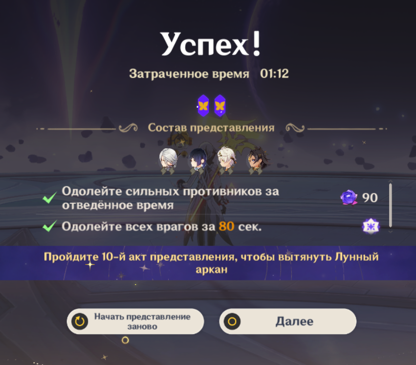 Прошел без ретраев. Одну звезду проебал на бобике Но так лень было чето с ним выдумывать, арлю давно слил а без нее одна йома осталась которая за 1 роту не убивает Тем не менее это лучший результат за все лунные театры - до этого было макс 10 звезд Потом клумба выйдет и с ней еще раз перепройду на 12 звезд