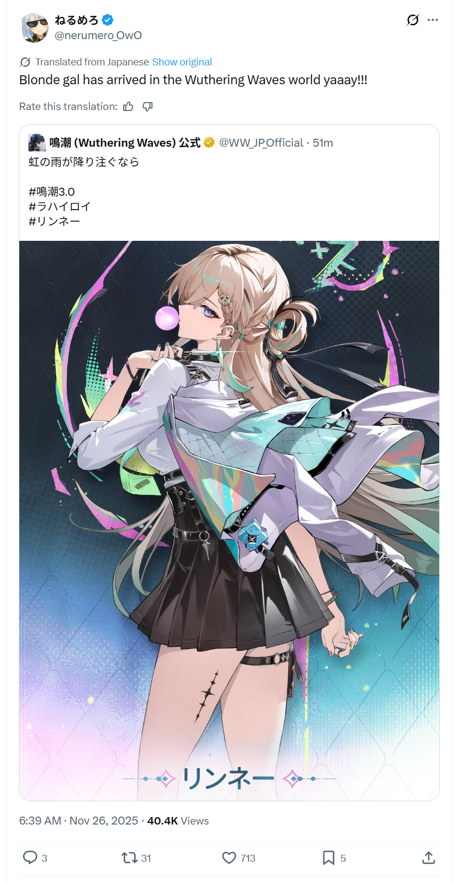 Бля, как же плохо то всё. Не то что бы я надеялся на что то, после Чисы. Но, я реально как дурачок поверил что у аутисточки будет лаконичный чёрно-белый костюмчик. А на деле, какое же говно... Она прям... хуёвая, опять эти висюльки, шторы, ленточки-хуенточки, повсюду. Даже нейро-ноги не такая проблема. Фиолетоволосая, просто рескин Сладкоушки, просто скип, это устаревший дизайн, и опять, нагромождение визуала. Рыжая эльфийка, да просто никакая, она настолько одинаково могла выйти в любой соседней гаче, потому что дизайн максимально общий. максимально дефолтный. Ну и остаётся блонди, но опять насрали курткой, под юбкой гигазаливка будет. Я просто даже хз, крутить или нет. Будет зависеть от элемента. Вообще, всё аэро инстаскип, Катьку и Юнону перебить невозможно до ЕОСа. На синему и игру это не повлияет, но думаю можно больше не заносить, кроме как на подписку. Уже 2-3 патча скипов намечается. Если только докручивать консты, что бы старых персов в актуалочке держать.