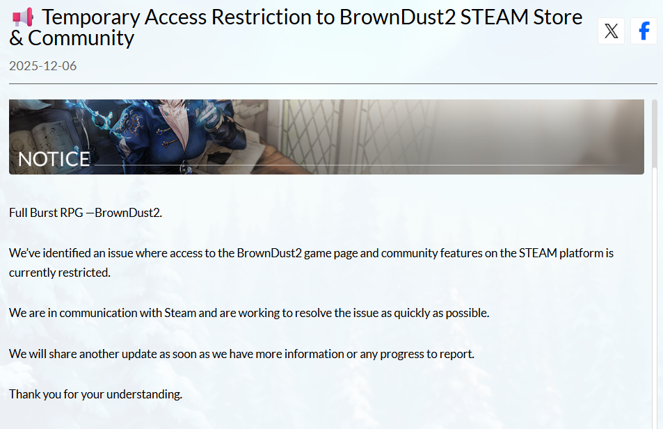 https://www.browndust2.com/en-us/news/view?id=10078 >First and foremost, we sincerely apologize for the disappointment and concern we have caused to many of our players. >Over the weekend, we carefully reviewed all valuable feedback shared across various channels, taking each comment seriously. >Based on these discussions, we held internal meetings throughout the weekend and into this morning. >In light of the seriousness of the situation, we will address the revised plans regarding content changes through an official broadcast.