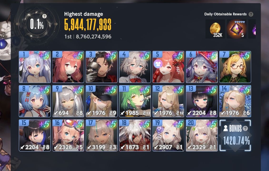 >>5710829 Сугой. Прока никакого, но сугой. Я тут тоже решил обновиться, раз давно не менял состав и шмот. Сначала добавил Тир и обновил шмот, насколько было не лень. Потом вспомнил, что у Дариан тоже большой множитель и всунул её в отряд, несмотря на плюс ноль.
