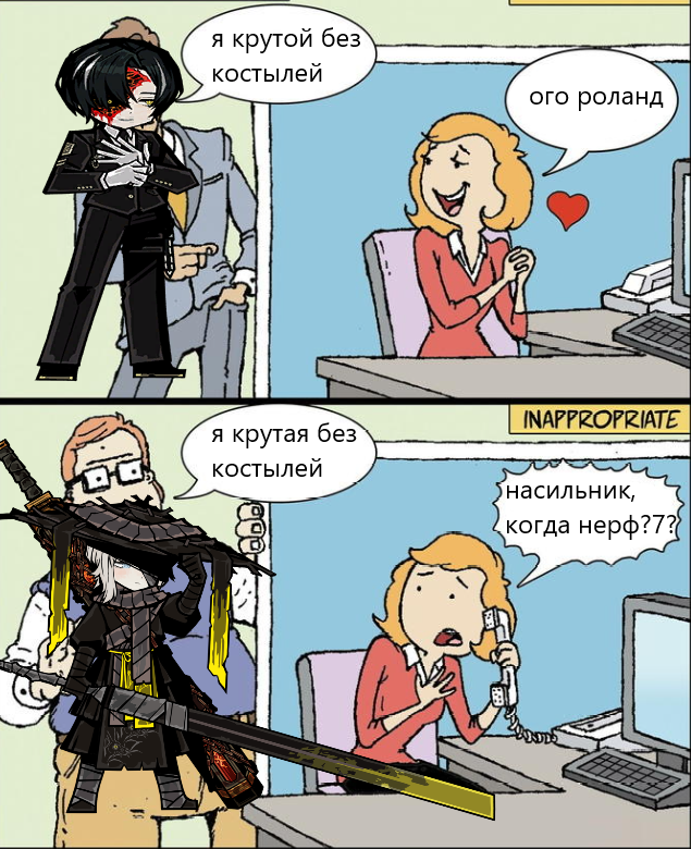 >>6550412 Пинкиходы. >>6550556 Дохуя, помню из "ремешков" только у лкк-шных кобуры были. Кстати, а нахуя они рисуют арты в фул рост когда в новелле они всегда по пояс обрезаются? У бати ринга вообще голова еле в кадр умещается.