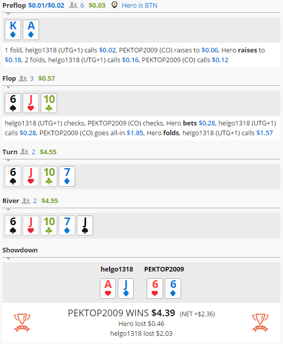 PokerStars Hand #145678376636: Hold'em No Limit ($0.01/$0.02 USD) - 2015/12/21 13:40:55 MSK [2015/12/21 5:40:55 ET] Table 'Simona II' 9-max Seat #8 is the button Seat 1: dutzuAA93 ($2 in chips) Seat 2: Fox-cub-2015 ($0.80 in chips) Seat 3: CherT678 ($2.19 in chips) Seat 5: Loerus13 ($1.81 in chips) Seat 6: JS091 ($2.26 in chips) Seat 7: A-Tugrik ($2 in chips) Seat 8: HERO ($2.18 in chips) Seat 9: MarkAvrelij ($2.03 in chips) MarkAvrelij: posts small blind $0.01 dutzuAA93: posts big blind $0.02 El Jump: sits out HOLE CARDS Dealt to HERO[Jc As] Fox-cub-2015: folds CherT678: folds Loerus13: folds JS091: raises $0.04 to $0.06 A-Tugrik: folds HERO: calls $0.06 MarkAvrelij: folds dutzuAA93: raises $0.14 to $0.20 JS091: calls $0.14 HERO: calls $0.14 FLOP [Qh 3c Ts] dutzuAA93: bets $0.45 JS091: folds HERO: calls $0.45 TURN [Qh 3c Ts] [Js] dutzuAA93: bets $1.35 and is all-in HERO: calls $1.35 RIVER [Qh 3c Ts Js] [3s] SHOW DOWN dutzuAA93: shows [Kd Ks] (two pair, Kings and Threes) HERO: shows [Jc As] (two pair, Jacks and Threes) dutzuAA93 collected $4.06 from pot