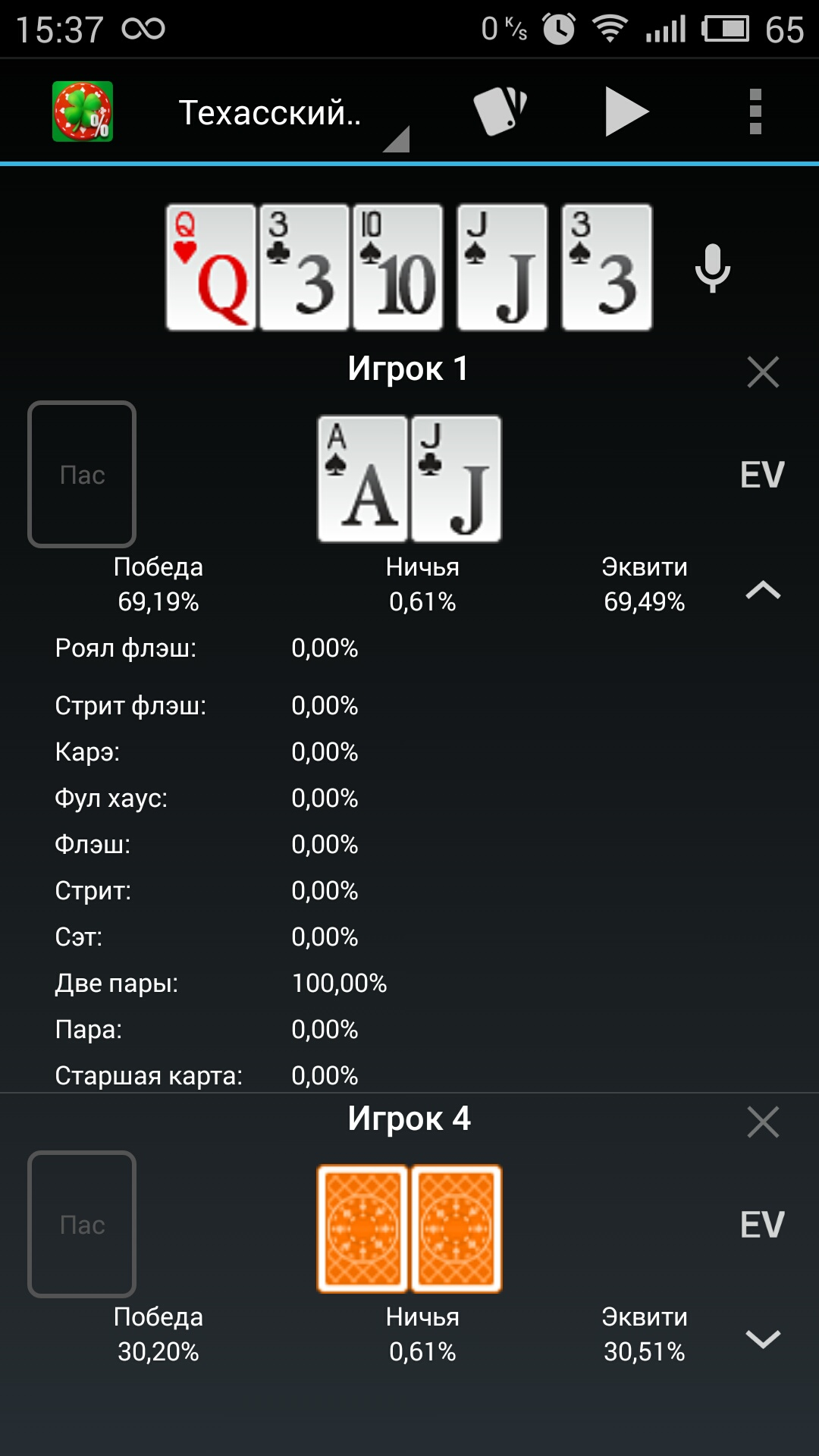 Вот такой нашел. Вот я сыграл раздачу, и понял, что допустил ошибку. Посмотрел на еквилабе - у меня там 64% на победу, 2к3, шансы к банку 1к2 - вроде всё правильно если я не туплю, но всёравно как-то не даёт мне покоя эта раздача. Как думаете?
