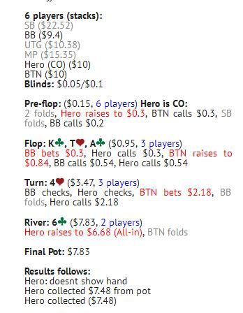 >>15524 Ну там рука-то КТ. И ставит он флоп чуть больше пол банка. Против некоторых оппов на микро будет ФЭ. Если я правильно понимаю фуллринг на нл2, у оппа будет рука карманка, которая на сет зашла.