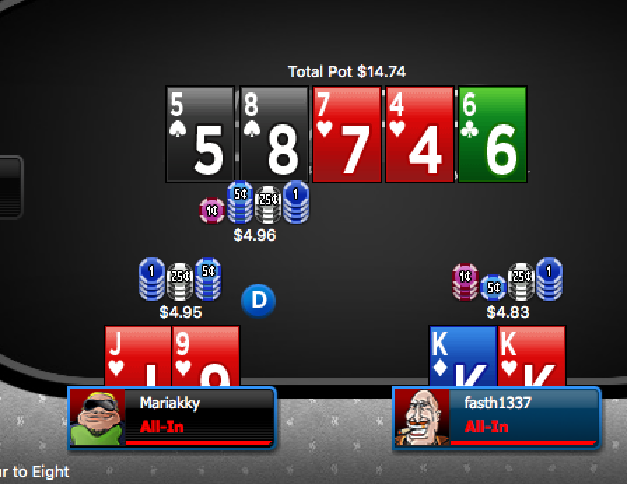 Как же я сгорел. В сит энд гоу зашел пачан которому либо похуй на даллары, либо он в тильте. И кароче он каждую раздачу оллинил, а когда его заколировали то он сначала одного выбил стритом, а потом и меня.