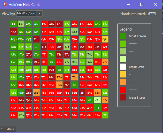 Я уже больше 100 СНГшек отыграл. Играю на 2-3 стола, по 10-11 в день. Пока прибыльно, но уж очень много тяжелых ситуаций за столом. В основном флоп и терн страдает. Еще полазил по ХМу, выдало интересную стату. Плохо, что всего 6к рук.