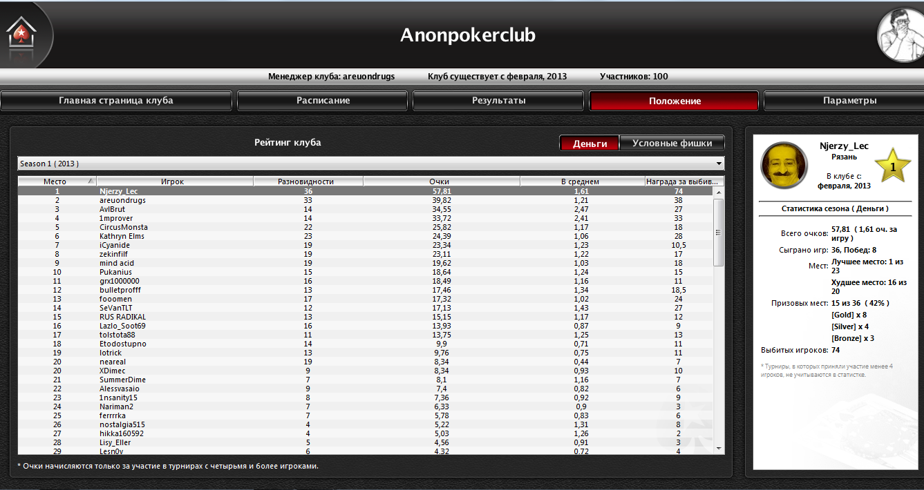 В клубе 95 человек, однако, здравствуйте. Все действо по прежнему происходит в конфе, взамен слабых, ушедшихопущенокэмо потихоньку подтягиваются люди, и пережившая недавно спад активности священная конфа опять оживает. Недавно один анон предложил интересную идею, поскольку у многих на счетах копейки или вообще 0, мы решили докинуть деньжат и устроить сентябрьский микролимитный марафон. Суть проста - участники играют в течении месяца, в конце определяется победитель и все проигравшие выплачивают ему часть того, что наиграли сами. Если быть точным, то правила таковы: - 1)НЛ2-НЛ5 (ЛЮБЫЕ СТОЛЫ) - 2)ПОБЕДИТЕЛЬ ПОЛУЧАЕТ 20% ОТ НАИГРАННОГО С КАЖДОГО ПРОИГРАВШЕГО - 3)СТАРТ В 00:00 01.09.13 - ОКОНЧАНИЕ 00:00 01.10.13 - 4)Обладатели минусового графика по окончании не платят взнос - 5)Отчетность с помощью графиков за указанный период по двум лимитам На данный момент участвовать согласилось 3,5 анона, у вас есть еще время добавится в конфу и записаться. И еще, на счет кидалова. Все конечно понимают что это возможно, особенно со стороны ньюфагов клуба. И не смотря на то что меня уже кидали на 10$лол, думаю все же у людей хватит мозгов понять насколько это невыгодное предприятие, т.к. ник и все известные данные этого покериста естественно будут засвечены (и обсосанны) не только тут, но и на всех известных покерных ресурсах всей нашей уютной конфой.