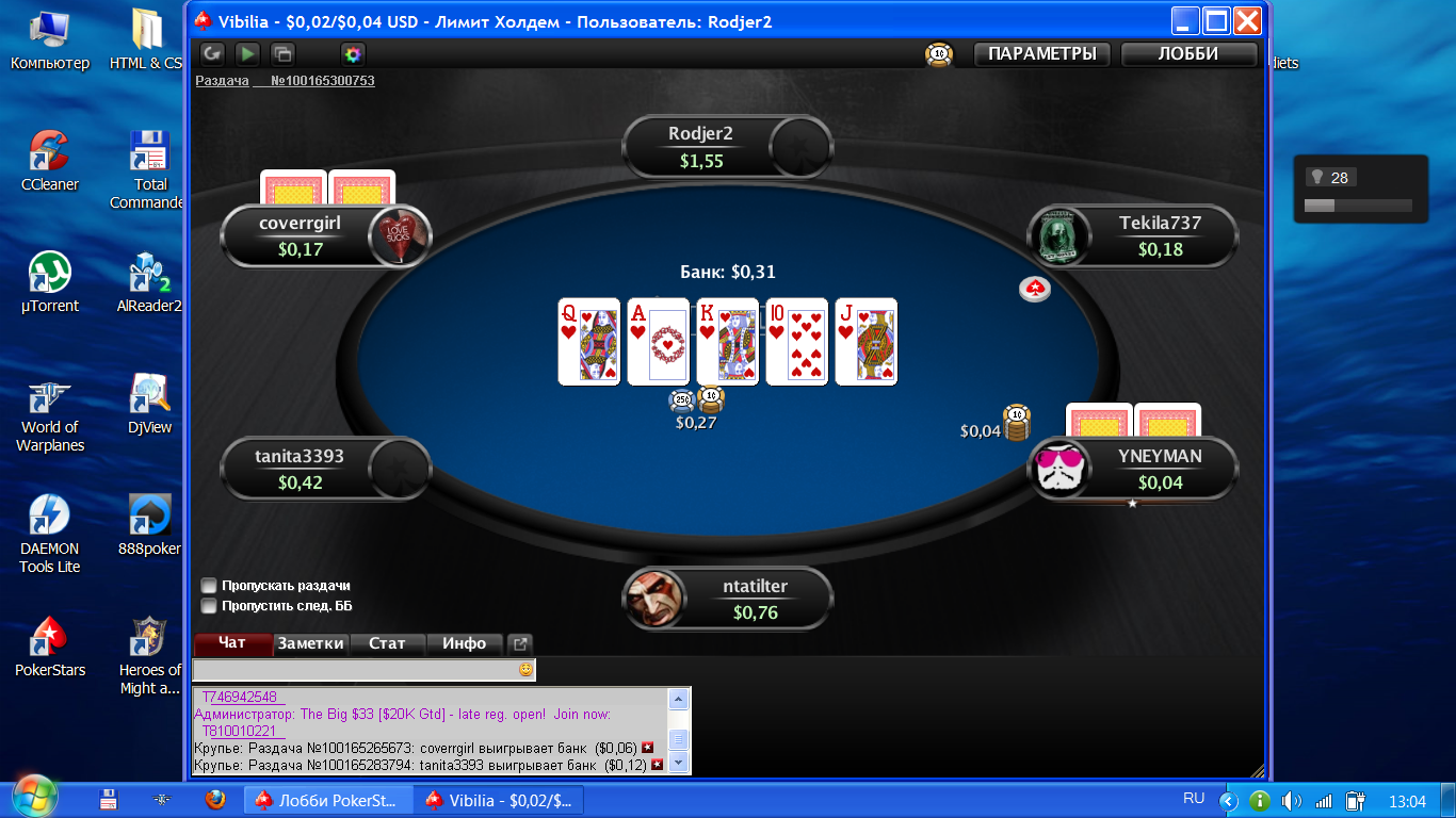 Пообщались с одним аноном и пришли к взаимовыгодному соглашению. 100 турниров по 0.5 цента, дележка 60/40. По результатам первой сессии +10би, что весьма неплохо. В клубе тем временем уже 7 человек, и только 1 из них в скайпе. Антоны, не добавившись в конфу вы проходите мимо 70% всей затеи. На 7рых, впрочем, уже можно устроить йоба мтт с 1 столом, лол. P.S. Это не значит что я раздаю деньги направо и налево, но такие возможности в нашем клубе присутствуют. Если не я, возможно кто то другой сможет помочь вам.