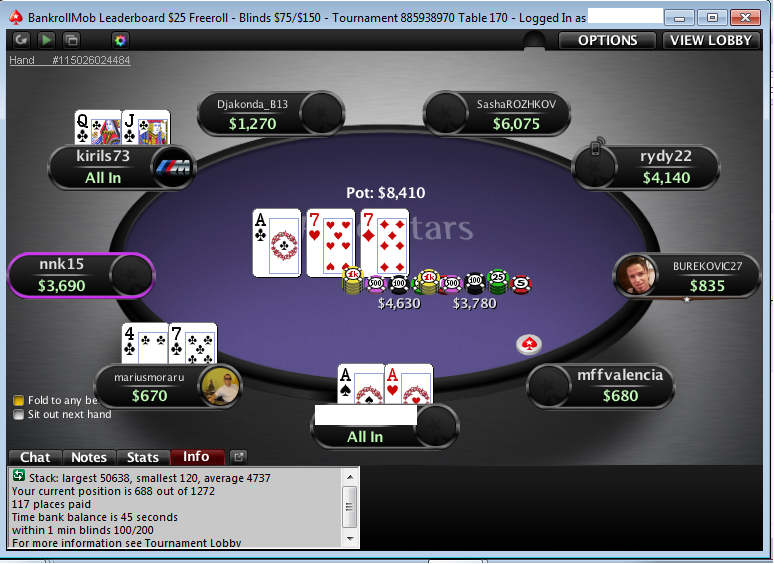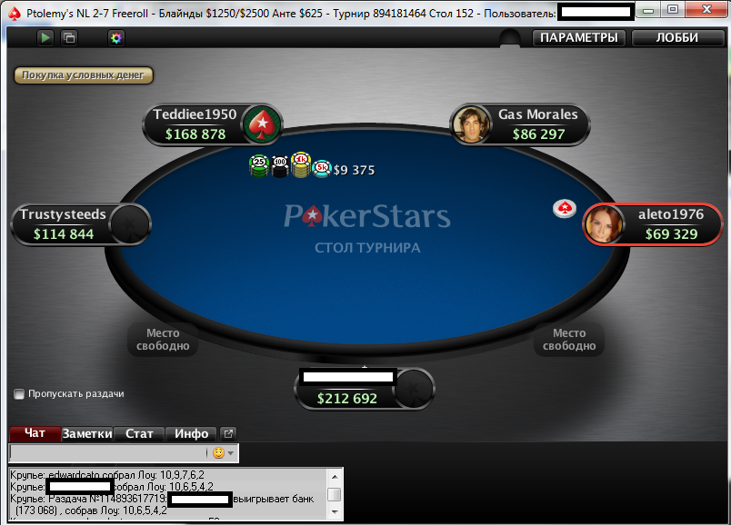 >>5976 Легко. Вот сейчас я закончил на 160 месте, переехали флашем без пары в алл-ин. Я для себя решил, что не буду деньги в покер херачить. Сидел 1 час 17 минут, пока не оказался в одной комнате со сплошными русскими и одними турками.