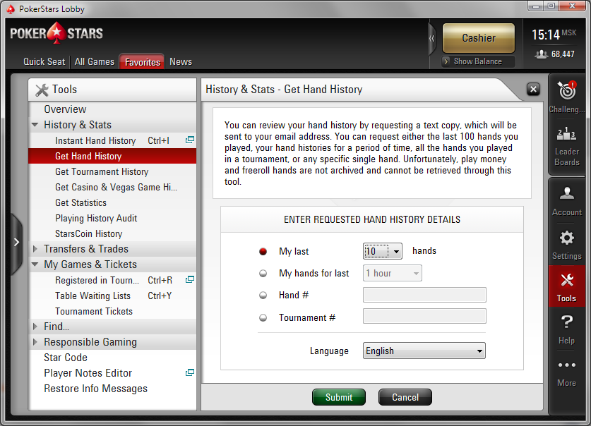 >>30562 Если у тебя сохранение истории рук не включено, то можно через Tools -> History & Stats -> Get Hand History заказать себе сыгранные руки на почту