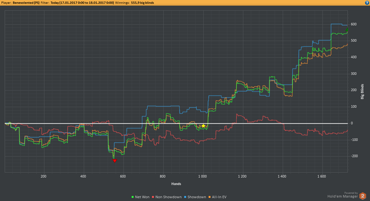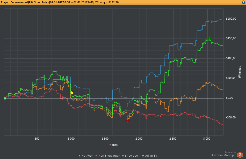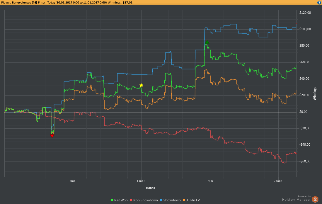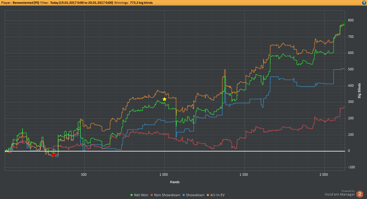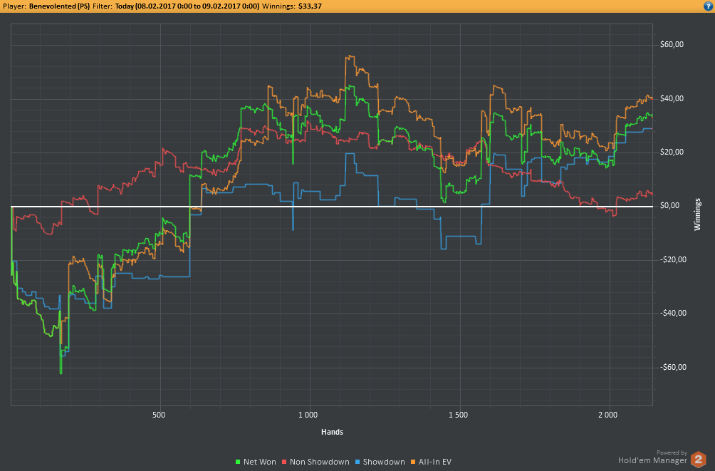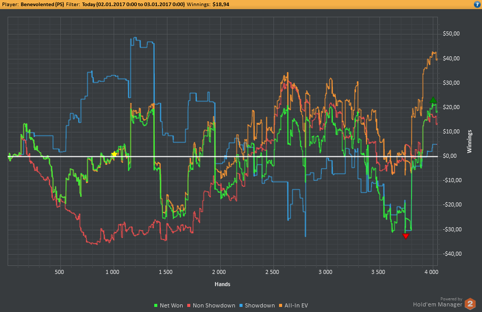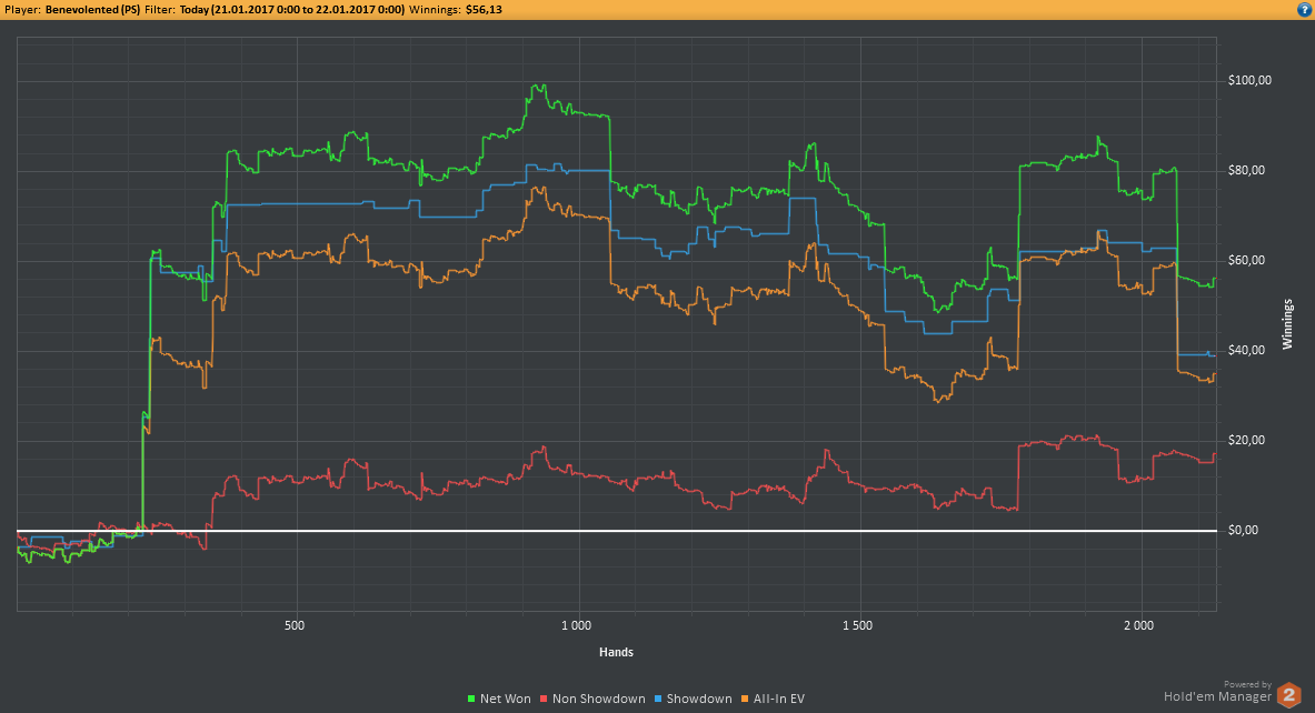 Вчера оформил худшую сессию, сегодня лучшую. Как же меня ебали первые 2к рук! Мне плакать хотелось от своих оверфолдов, постоянных сплитов, доездов 1%-х! Ебучие раннер-раннеры всюду. Профит должен быть минимум в полтора раза больше, это был ебучий даунстрик и у меня до сих пор бомбит от того пиздеца that made my eyes and ass bleed. Алсо, это самая длинная сессия за последние несколько месяцев, и это радует меня даже больше, чем деньги, которые я завтра так же залью. Я хочу снова гриндить.