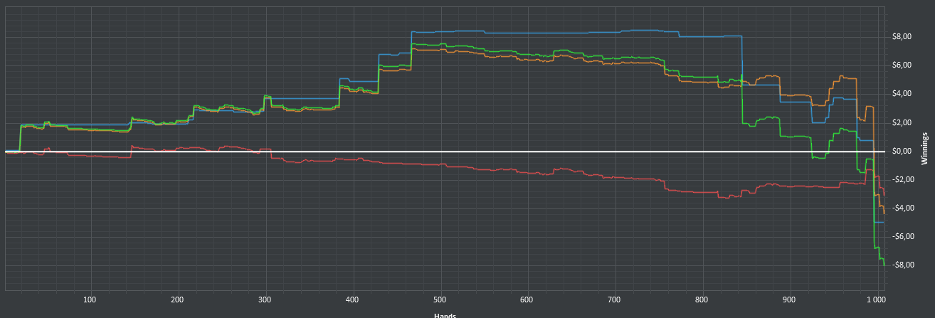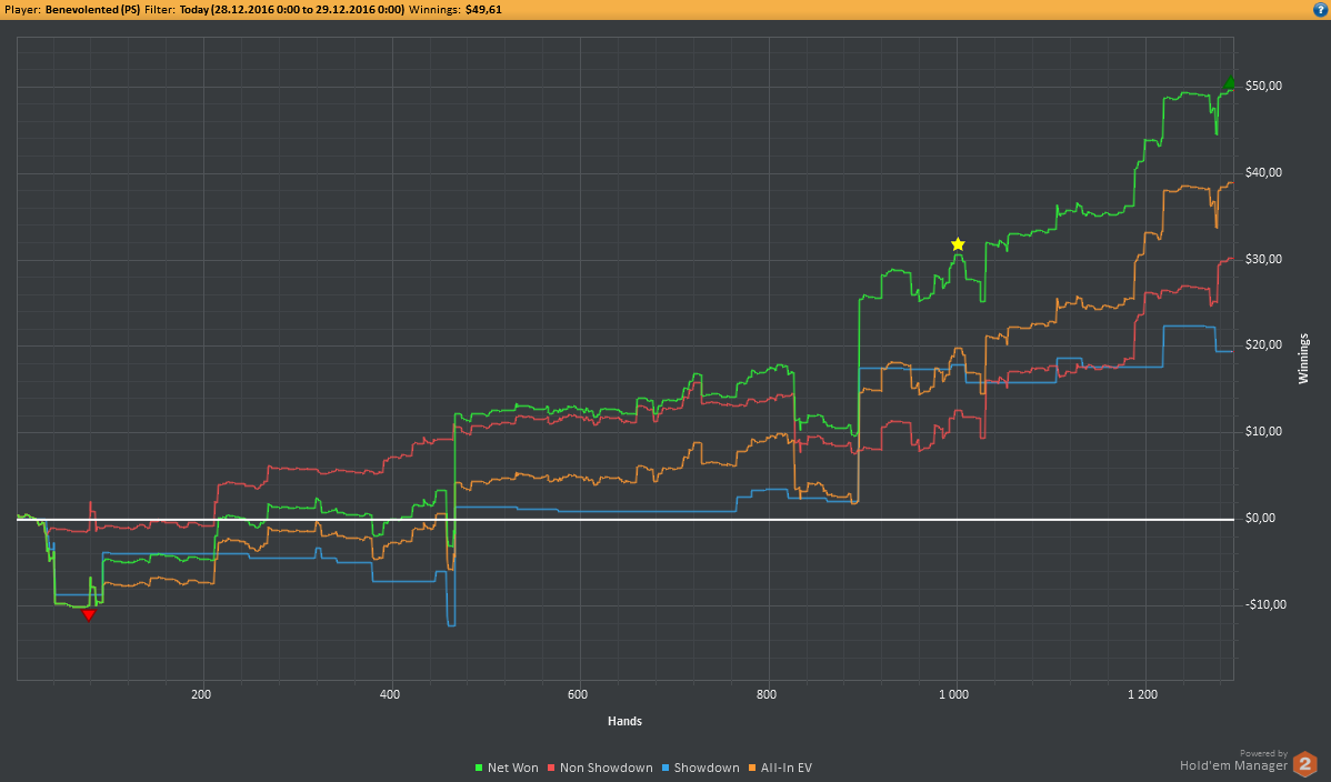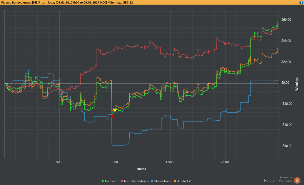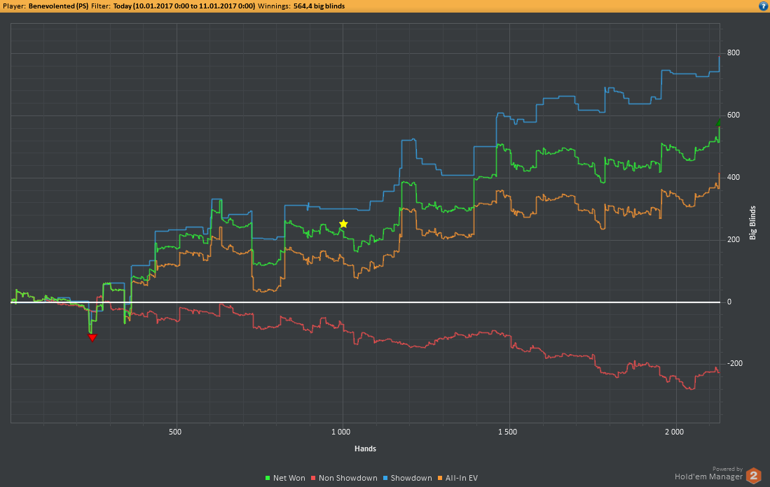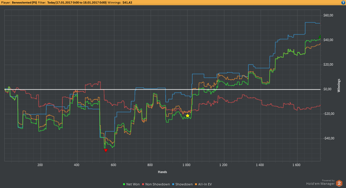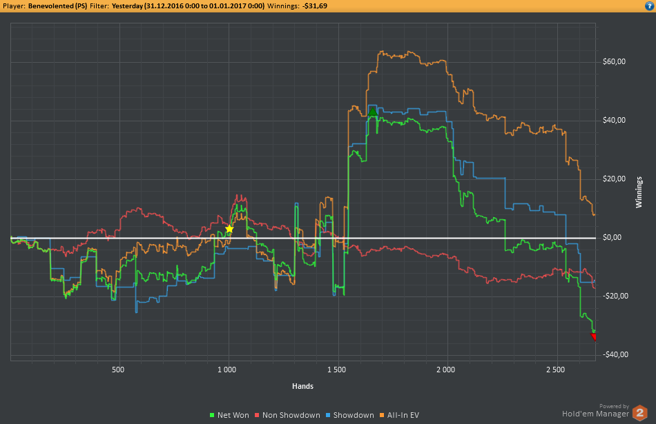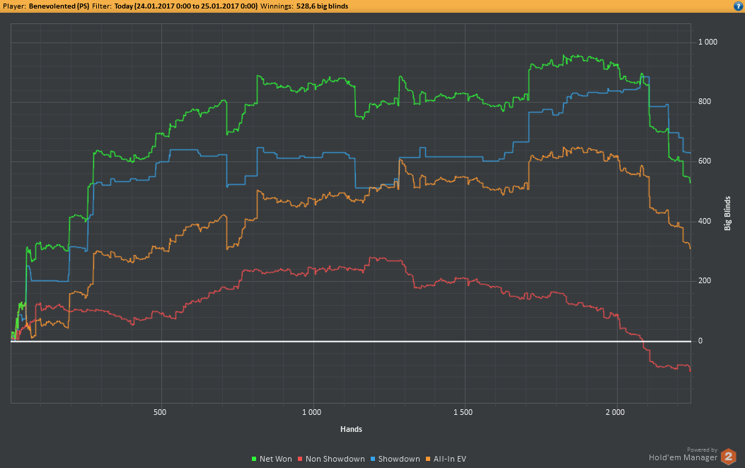 Вчера оформил худшую сессию, сегодня лучшую. Как же меня ебали первые 2к рук! Мне плакать хотелось от своих оверфолдов, постоянных сплитов, доездов 1%-х! Ебучие раннер-раннеры всюду. Профит должен быть минимум в полтора раза больше, это был ебучий даунстрик и у меня до сих пор бомбит от того пиздеца that made my eyes and ass bleed. Алсо, это самая длинная сессия за последние несколько месяцев, и это радует меня даже больше, чем деньги, которые я завтра так же залью. Я хочу снова гриндить.