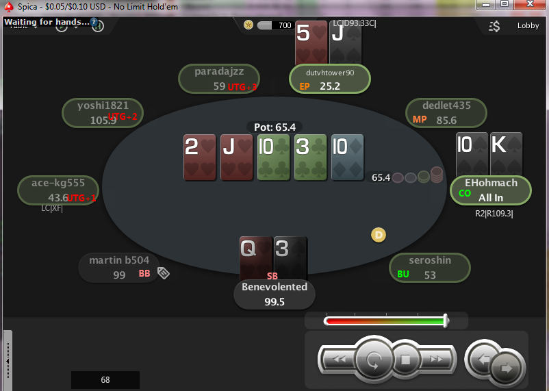 http://www.handconverter.com/hands/3009826 Жопошно сыграл, не добрал капитально. А фиш был не пустой! С другой стороны, это была одна из первых раздач, и если бы я проиграл, то это могло бы подкосить мой дух.