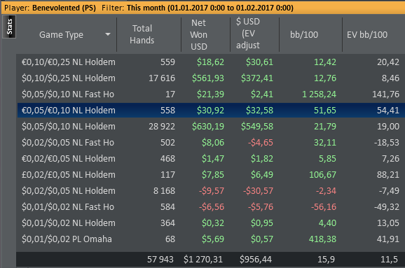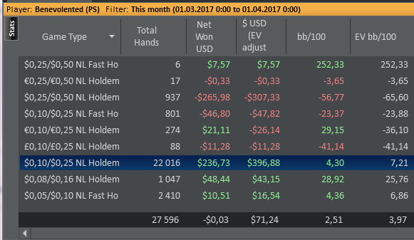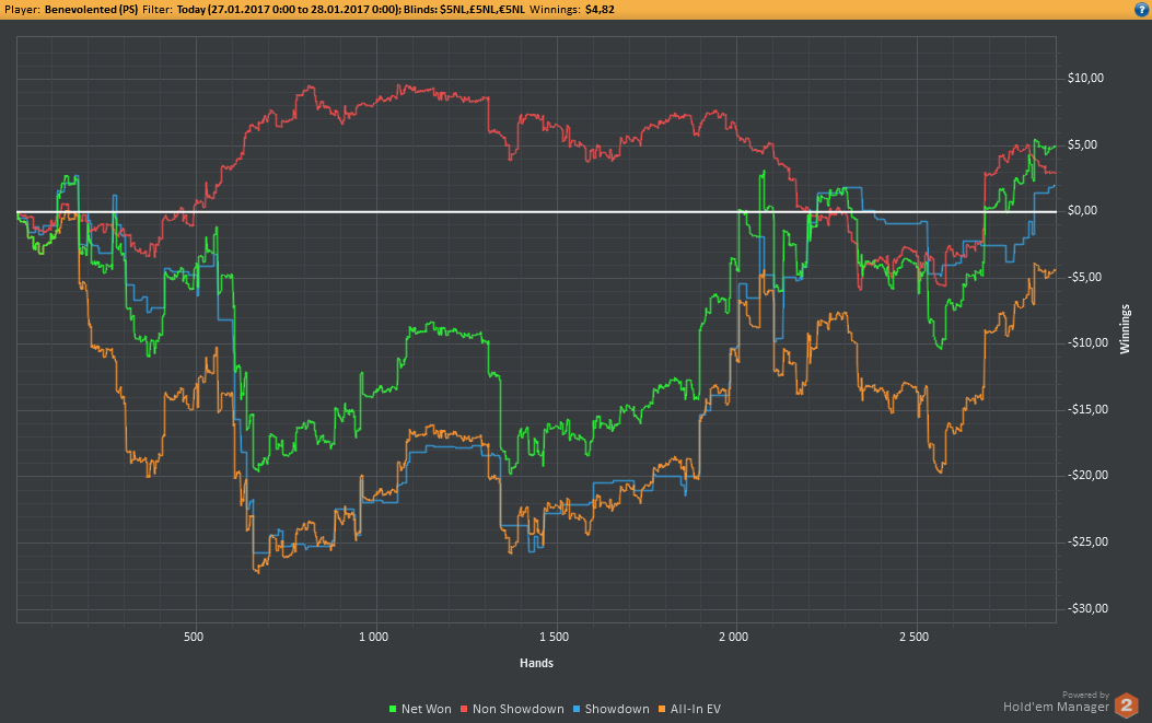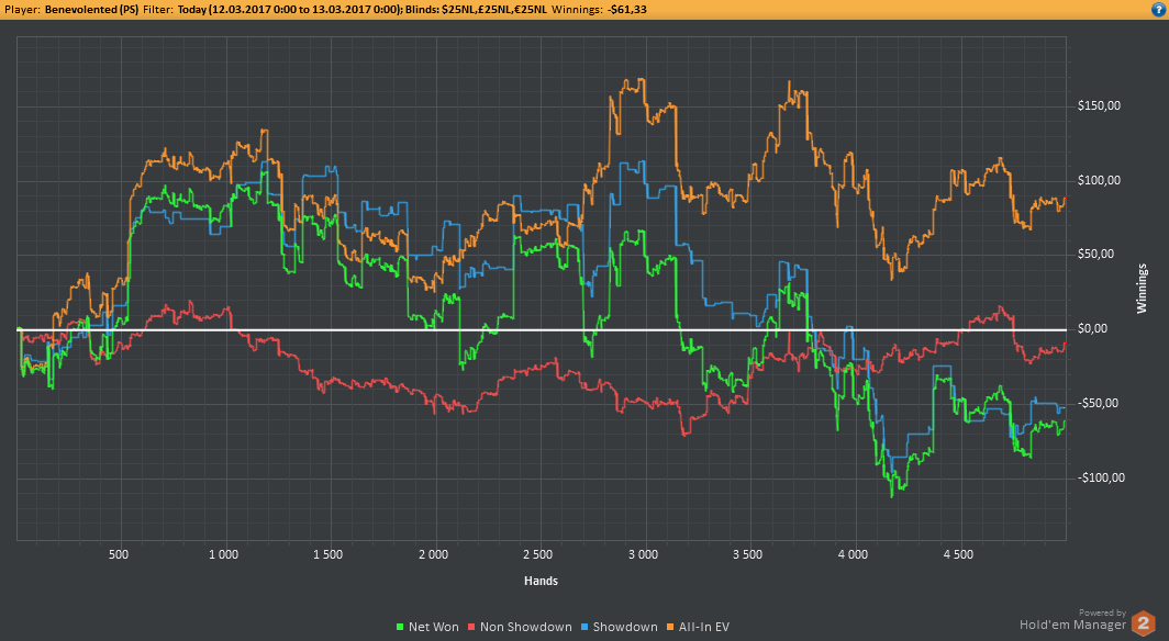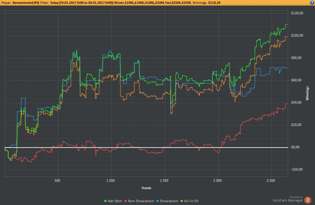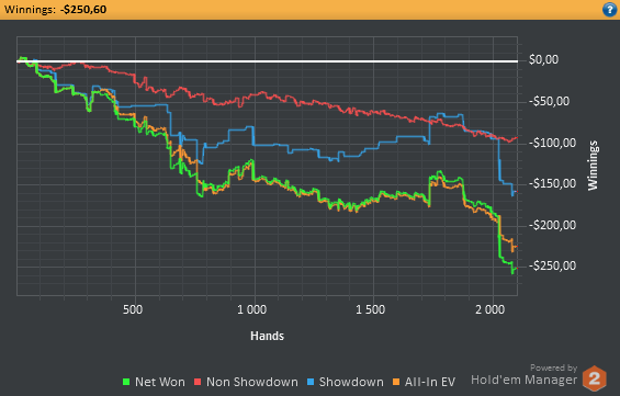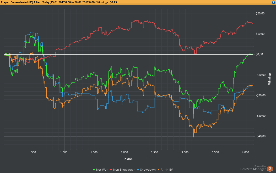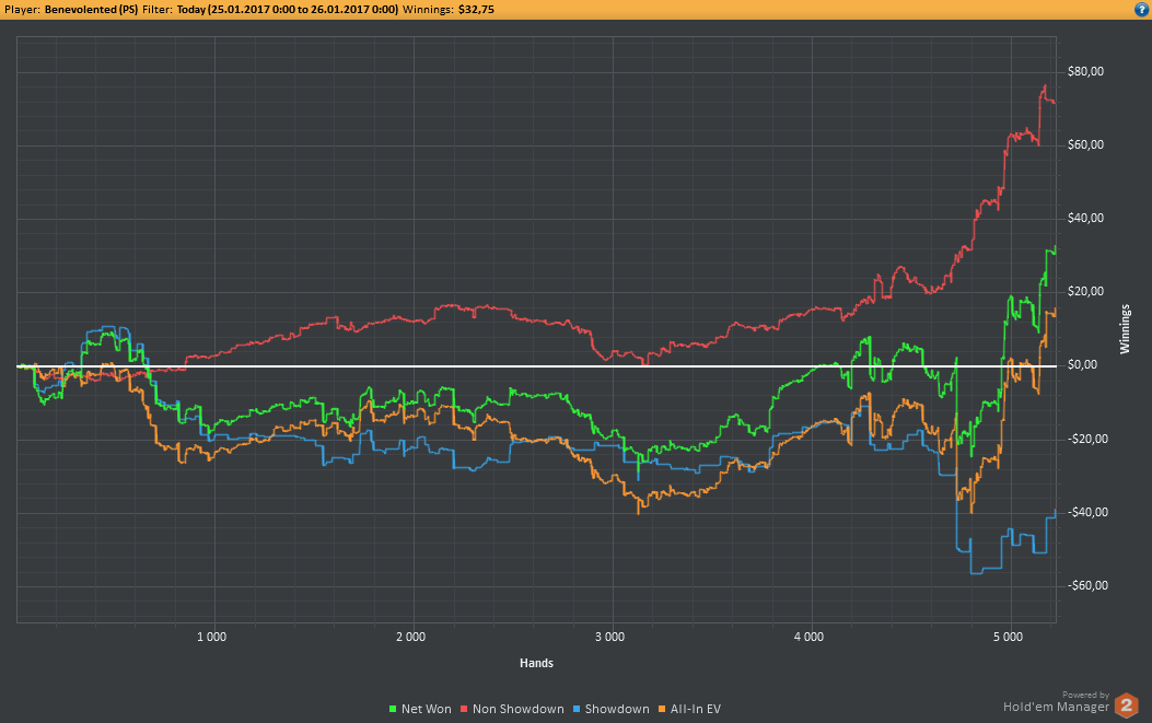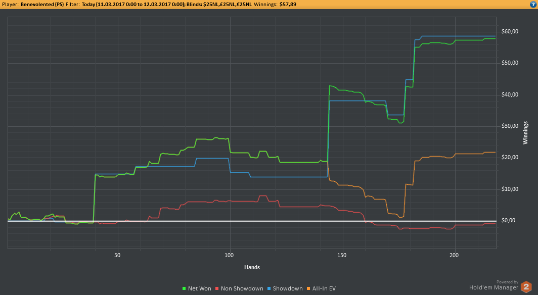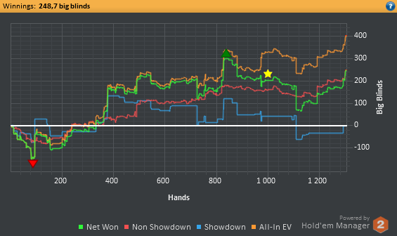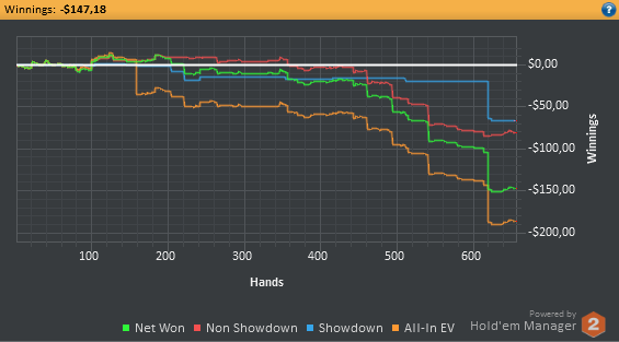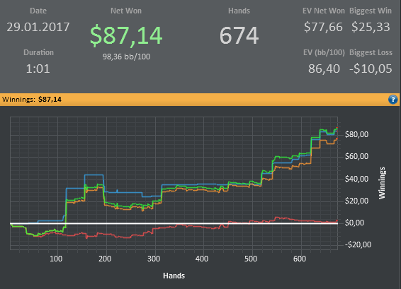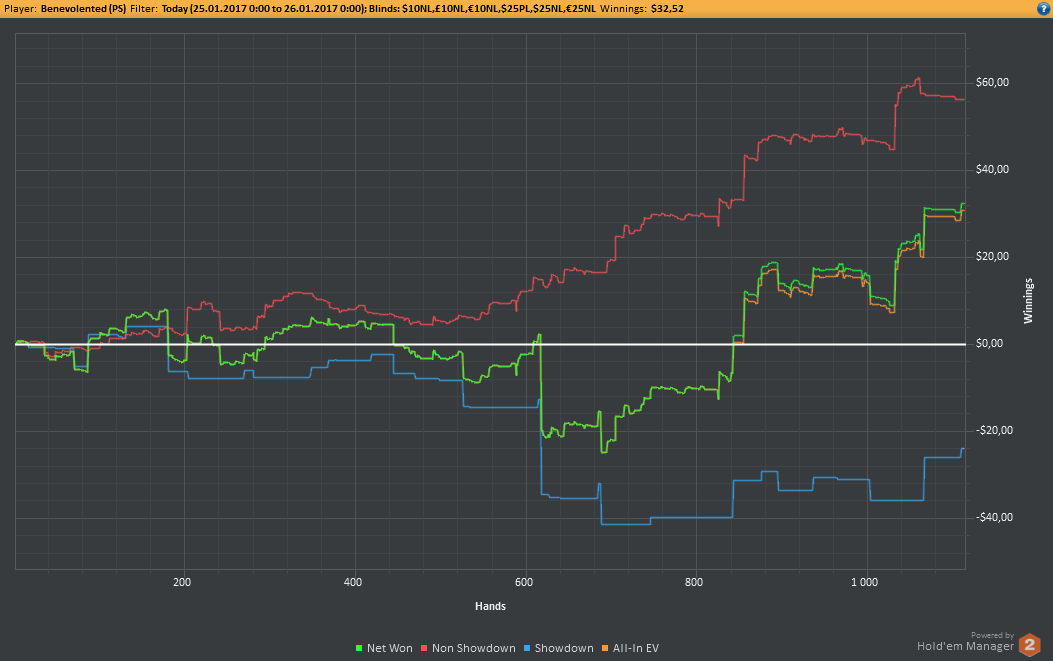 Даже не знаю, по-моему, пока всё плохо, но не так чтобы усираться. Но 8-9бб/100 на нл25 внушают надежду, что и здесь смогу что-то плюсовать. С другой стороны, у меня сорт оф агробрм для этого лимита, я не привык играть с 30-40БИ на новых лимитах, деньги снова давят, хотя казалось бы, уже забыл, что это за чувство.