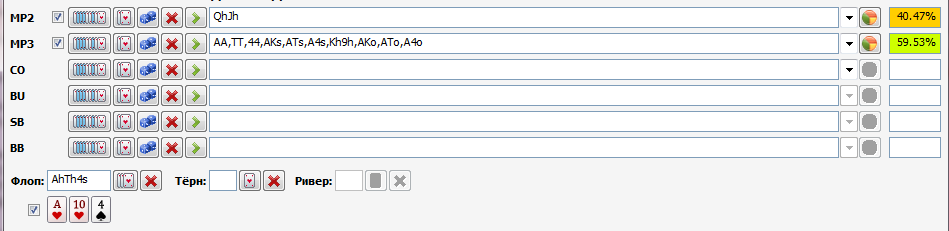 >>32354 >Синим рейз, я так понимаю. Желтым лимп, а красным играем через раз? И зеленым подчеркнуто это что такое? Нет. Все рейз. Справа нужные частоты. Там только KQo надо подправить. Открывается 47%, а не 42. В спешке не обратил внимание.