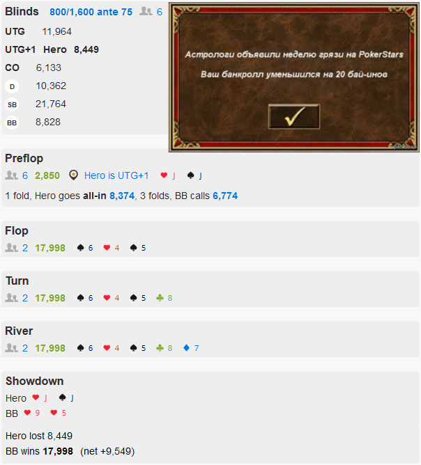 http://www.handconverter.com/hands/3008595 С этого дерьма мне разворотило жопу. Не потому что опп поймал сет с рукой, которую на катоффе трибетить по меньшей мере очень глупо, а потому что ебаные старзы положили мне трипс. По любой другой карте, даже тузу, я почти всегда буду фолдить тёрн. Но нет, меня переехали в обратную сторону с 8% ранаутом против очень агрессивного оппа. Ев? Ебал я ев.